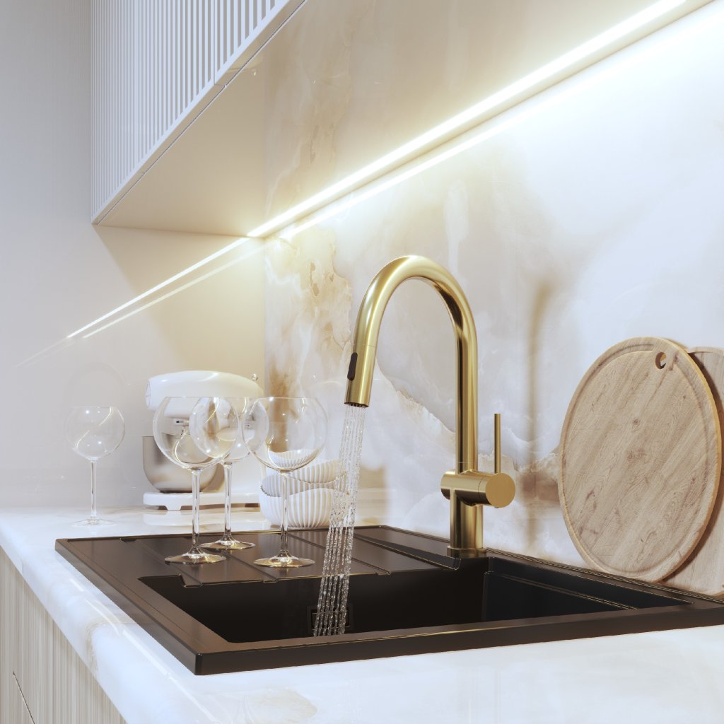 Bateria de bucătărie modernă ANA , cu un finisaj elegant auriu mat, prezintă un design minimalist care va oferi oricărei bucătării un aspect curat și atemporal. Datorită suprafeței netede și a manoperei precise, arată luxos, dar în același timp rămâne extrem de practică pentru utilizarea de zi cu zi.