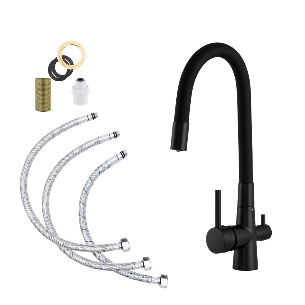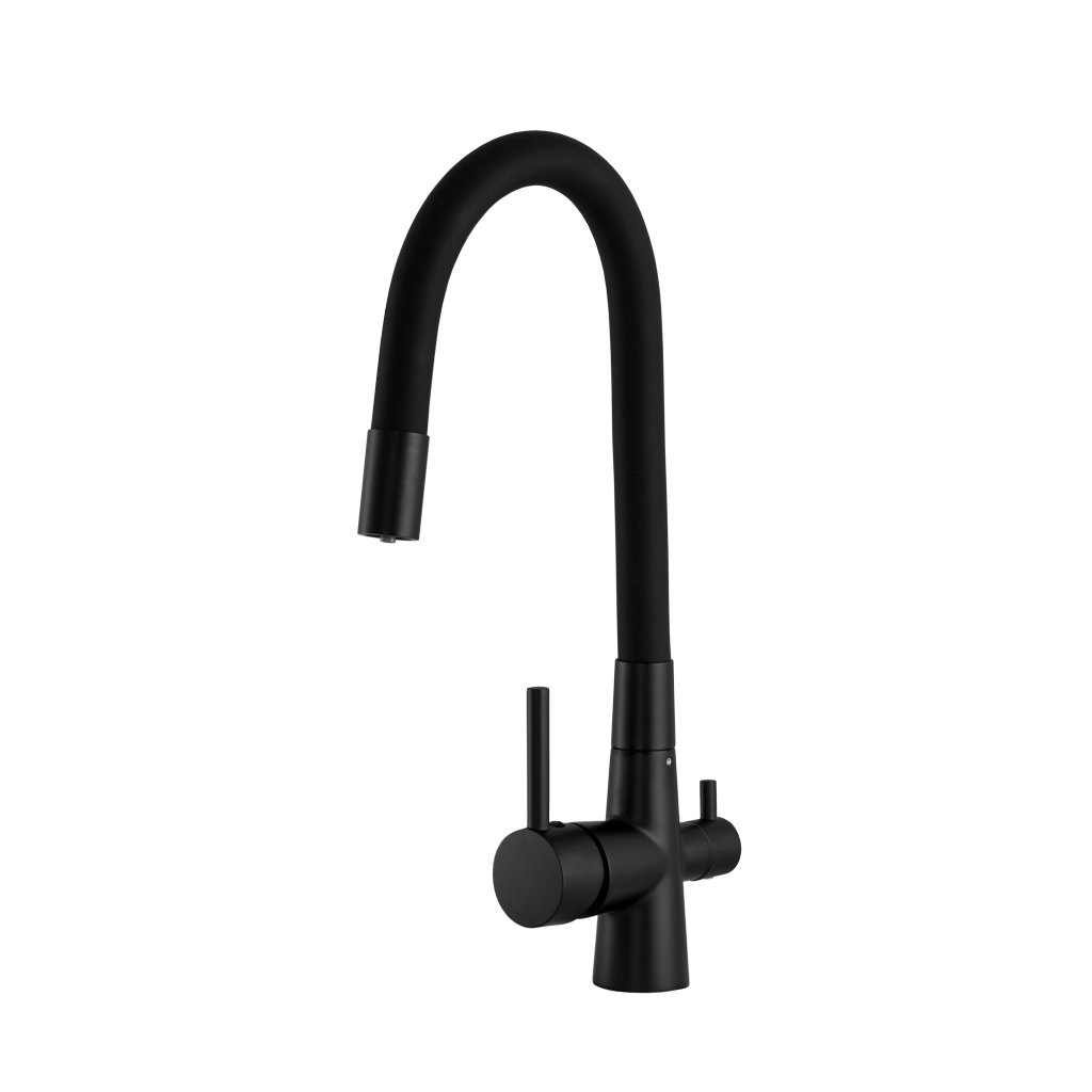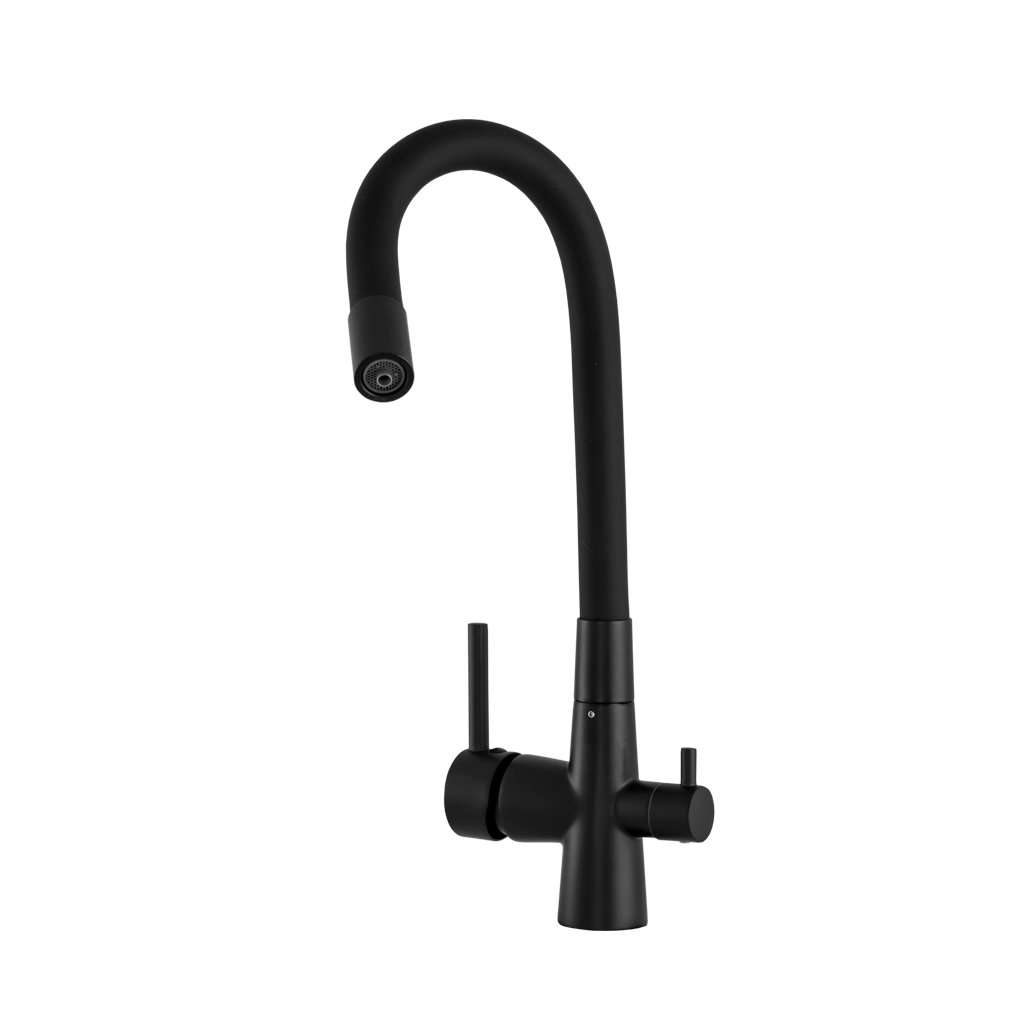 Gamma Flex, baterie de chiuvetă cu trei căi cu braț flexibil cu racord pentru filtru de apă, negru mat, GMA-BFXF-BK