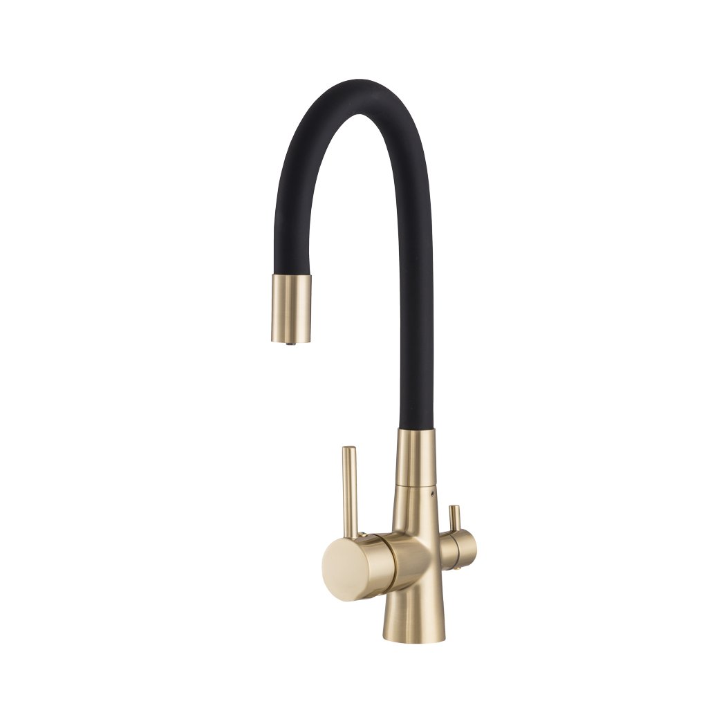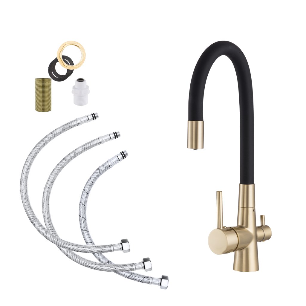Gamma Flex, baterie de chiuvetă cu trei căi cu braț flexibil cu racord pentru filtru de apă, negru mat-auriu mat, GMA-BFXF-BGD