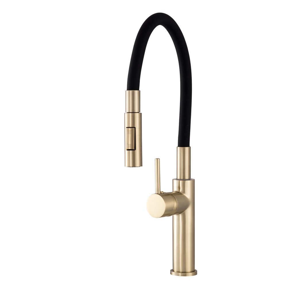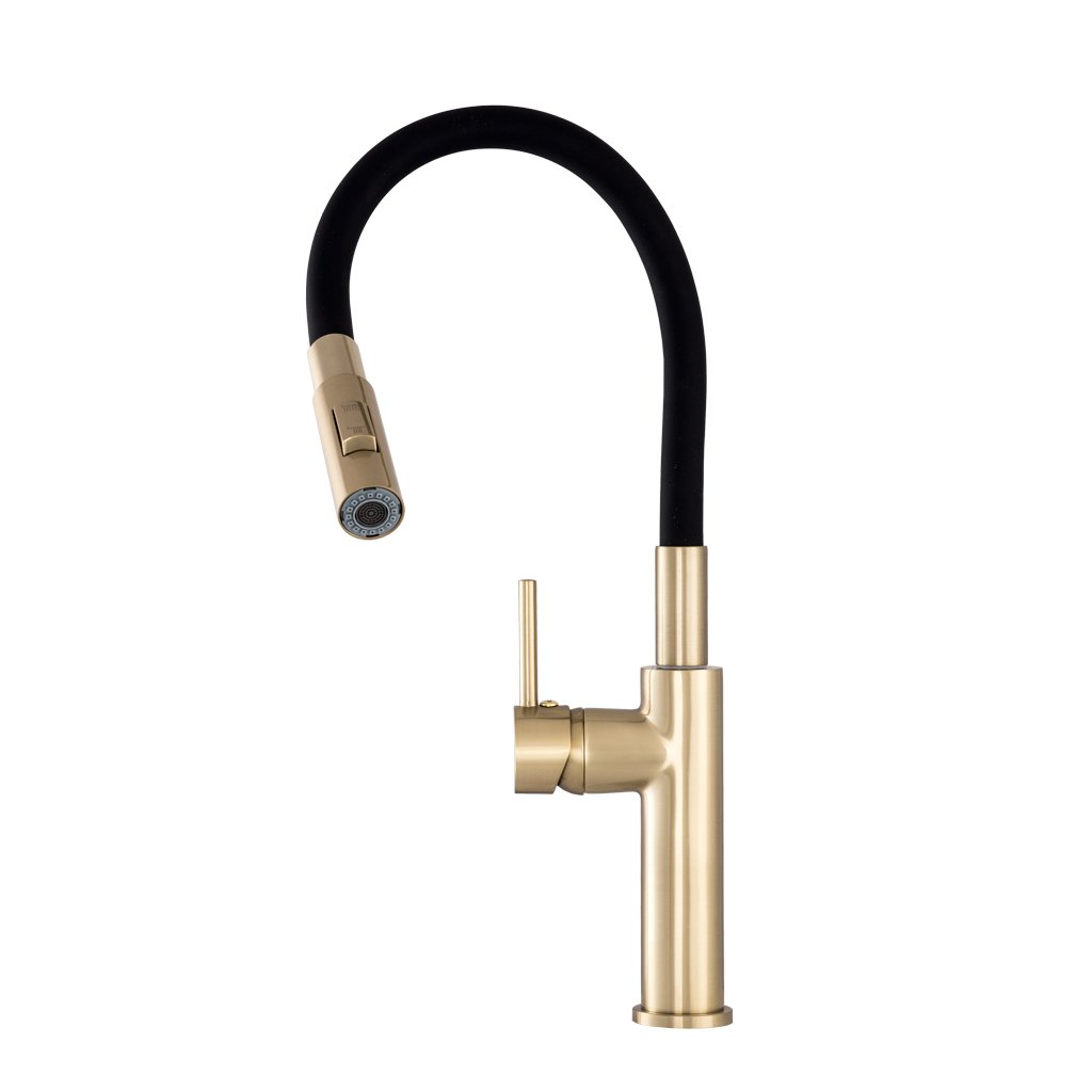 Gamma Full New, baterie de bucătărie înaltă cu braț flexibil și spray, negru-auriu mat, GMA-BFLN-BGD
