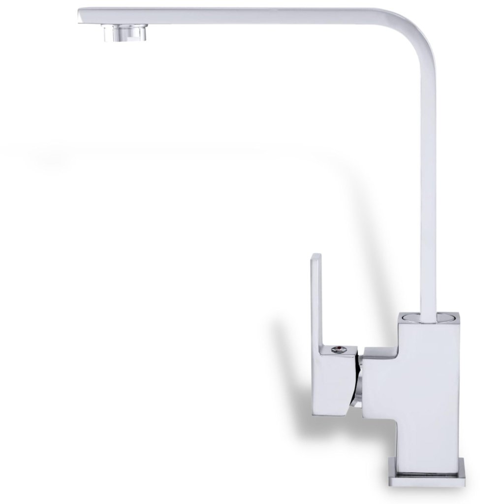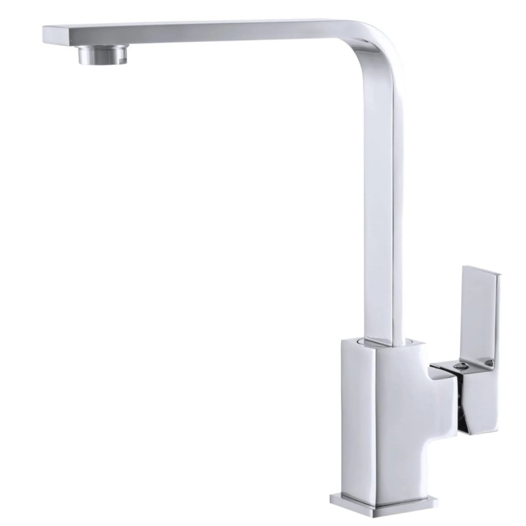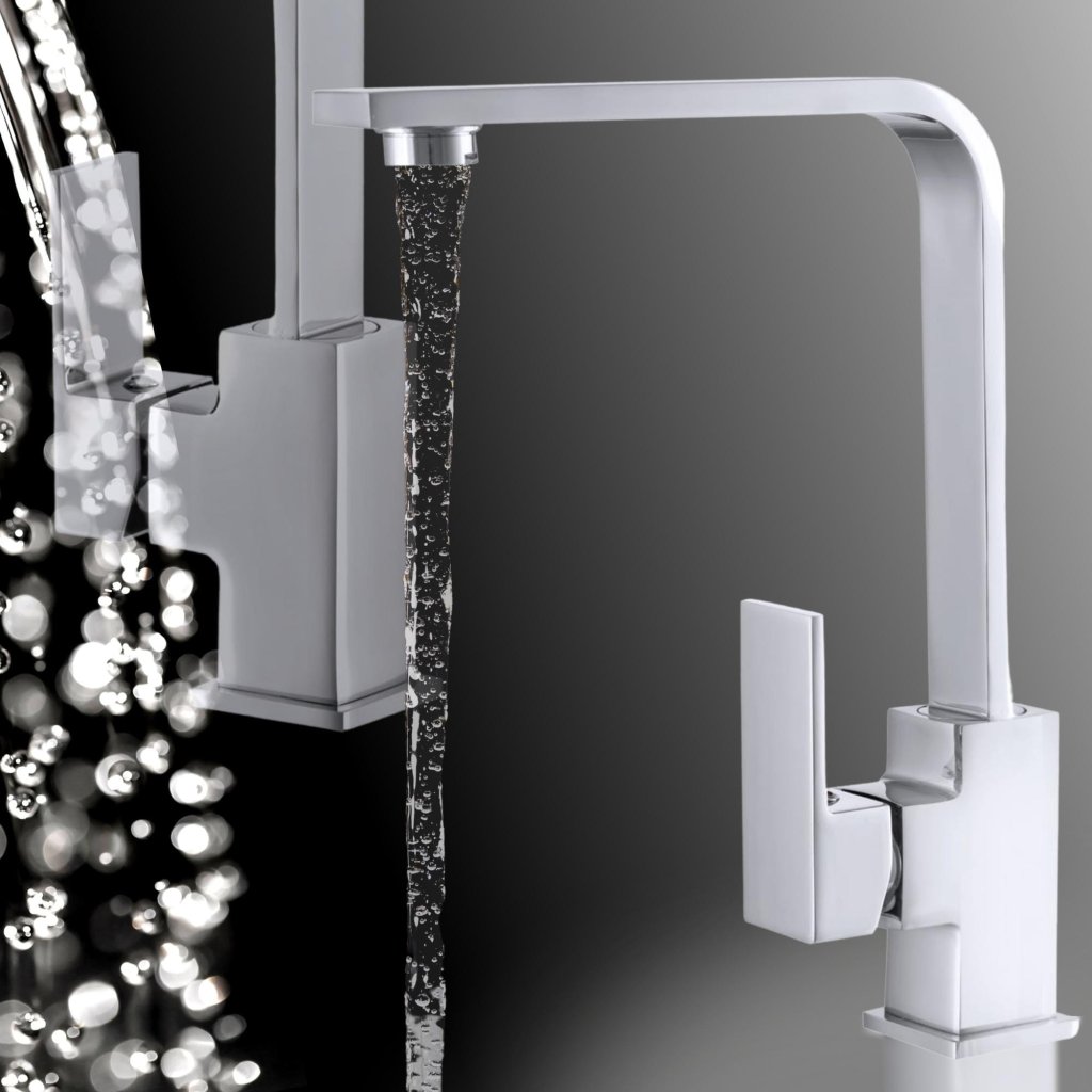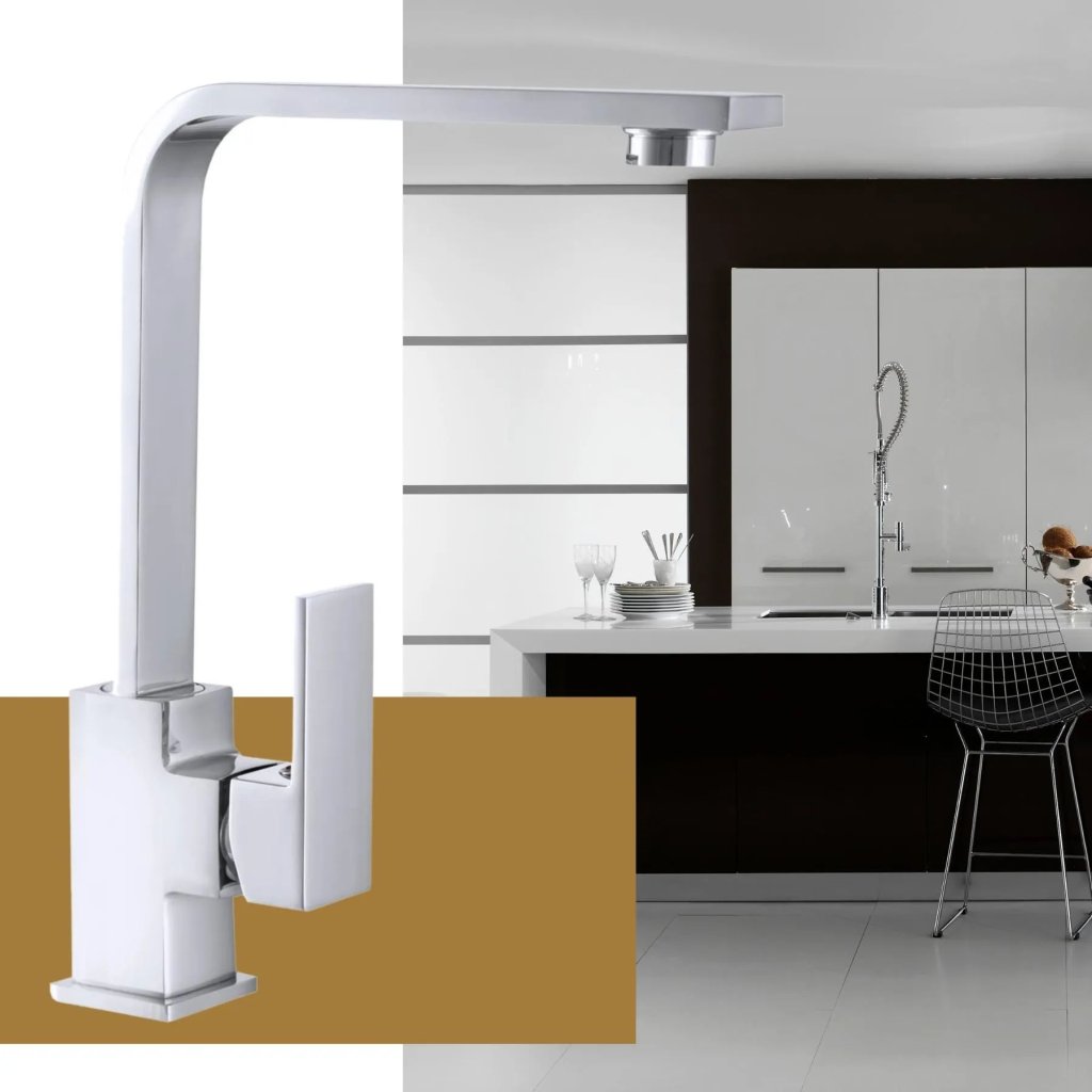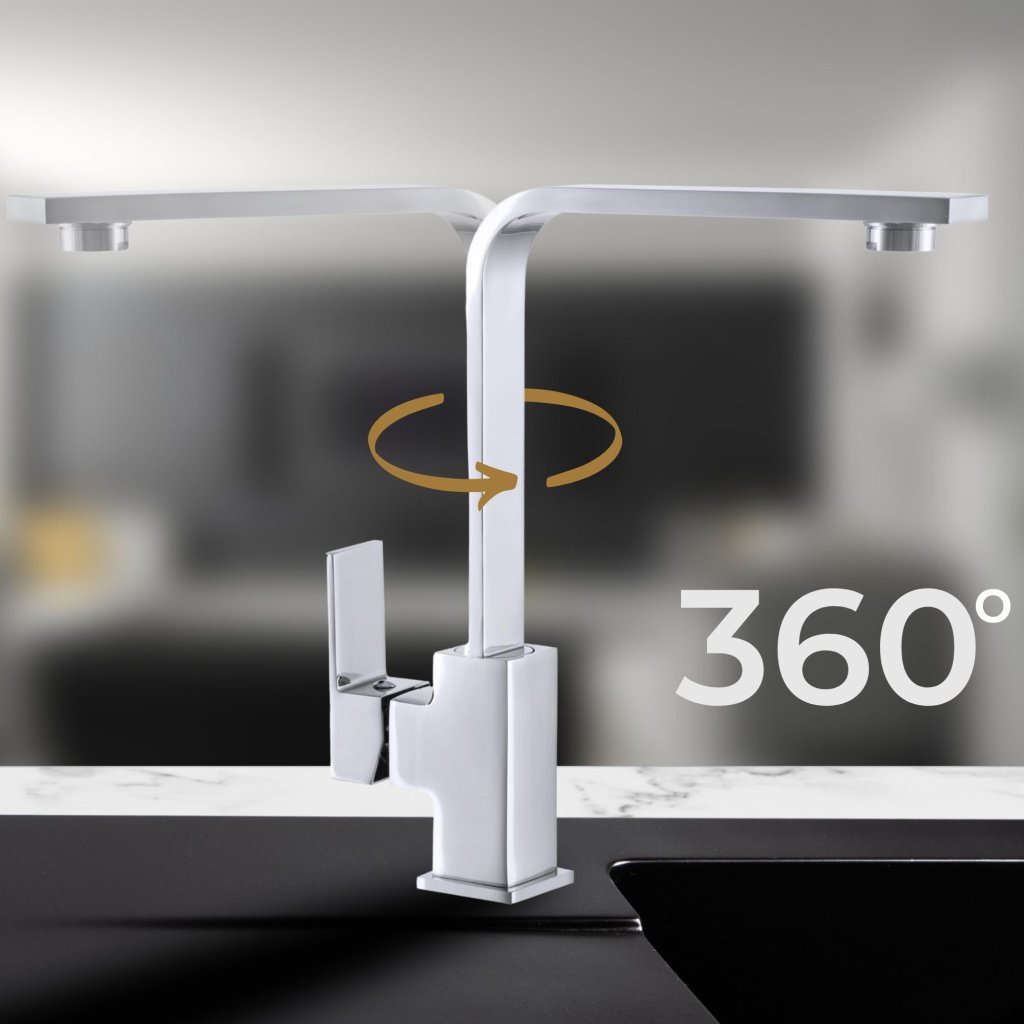 Robinetul de bucătărie cromat de designer se potrivește perfect cu culoarea chiuvetelor din granit. Corpul din alamă solidă cu finisaj unghiular creează o soluție modernă și durabilă pentru o bucătărie elegantă.