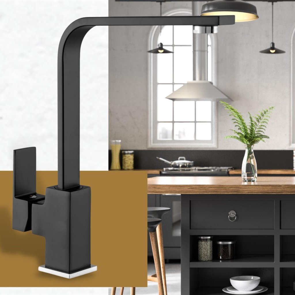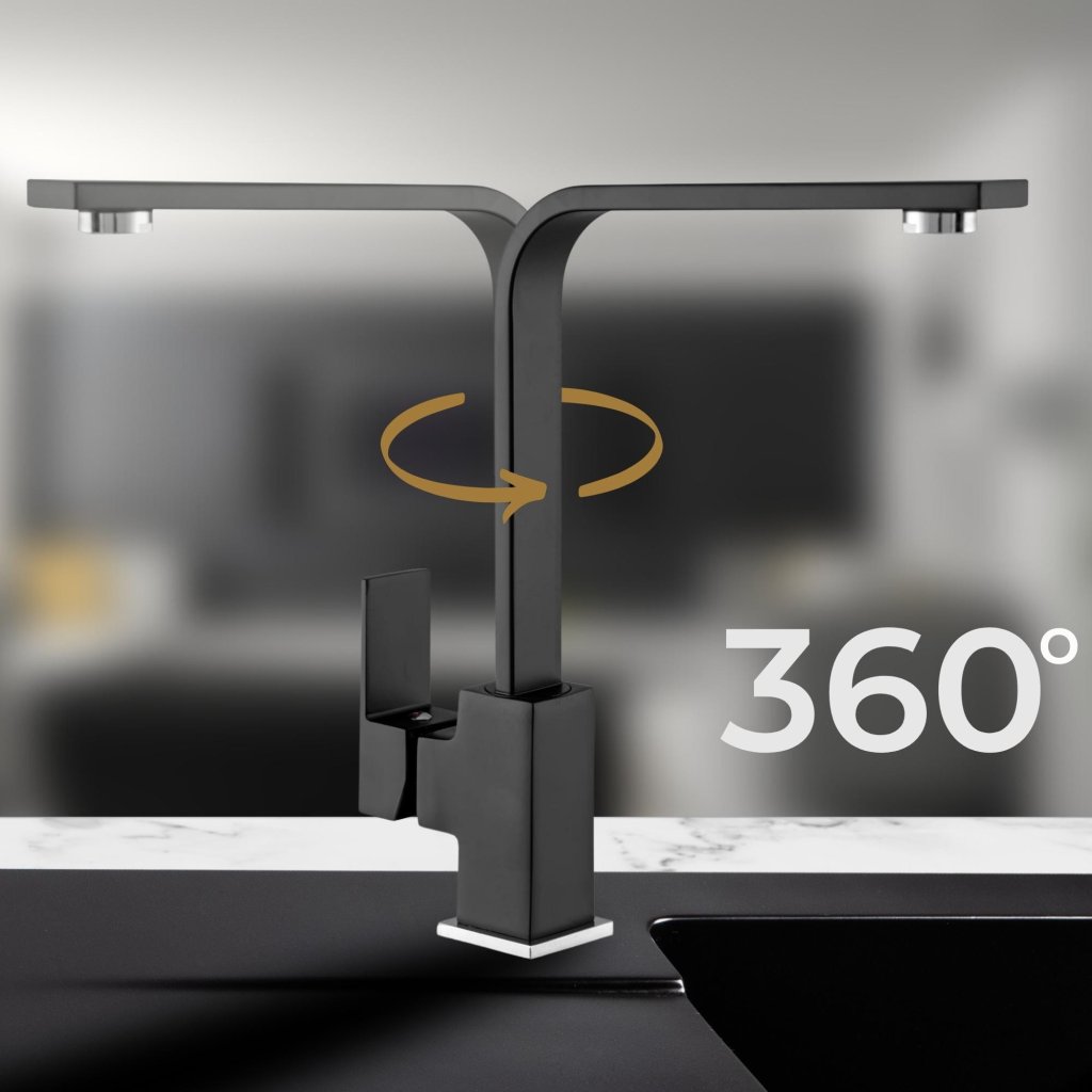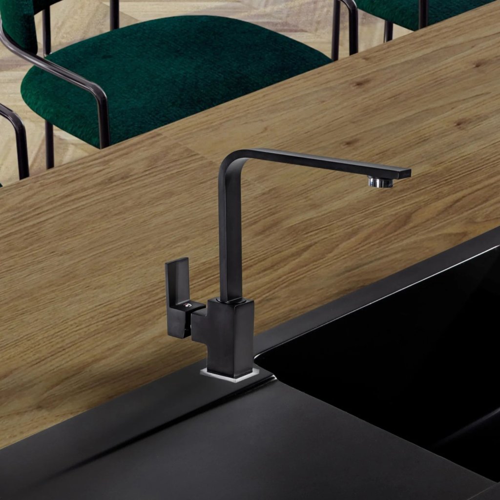 Robinetul de bucătărie negru de designer se potrivește perfect cu culoarea chiuvetelor din granit. Corpul din alamă solidă cu finisaj unghiular creează o soluție modernă și durabilă pentru o bucătărie elegantă.