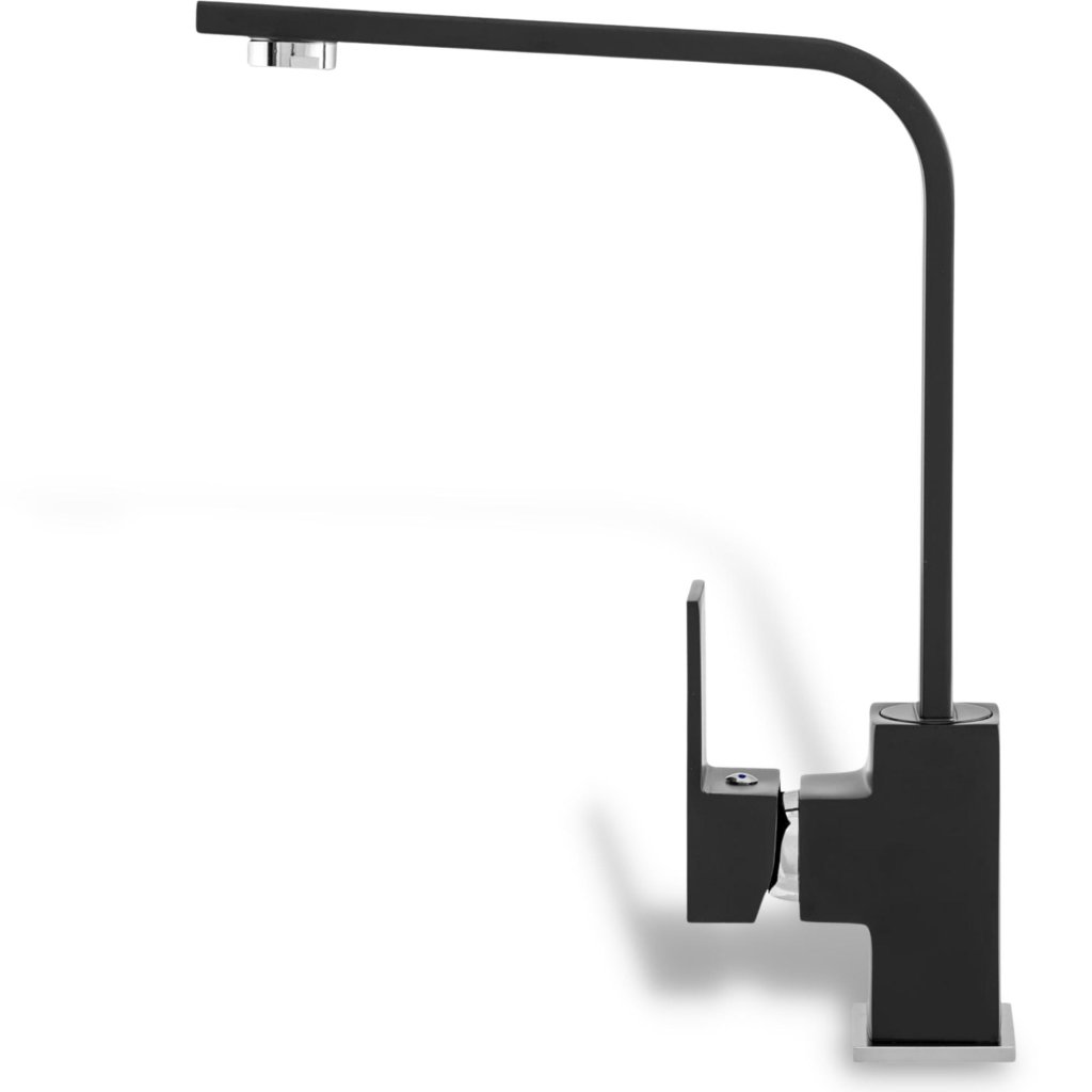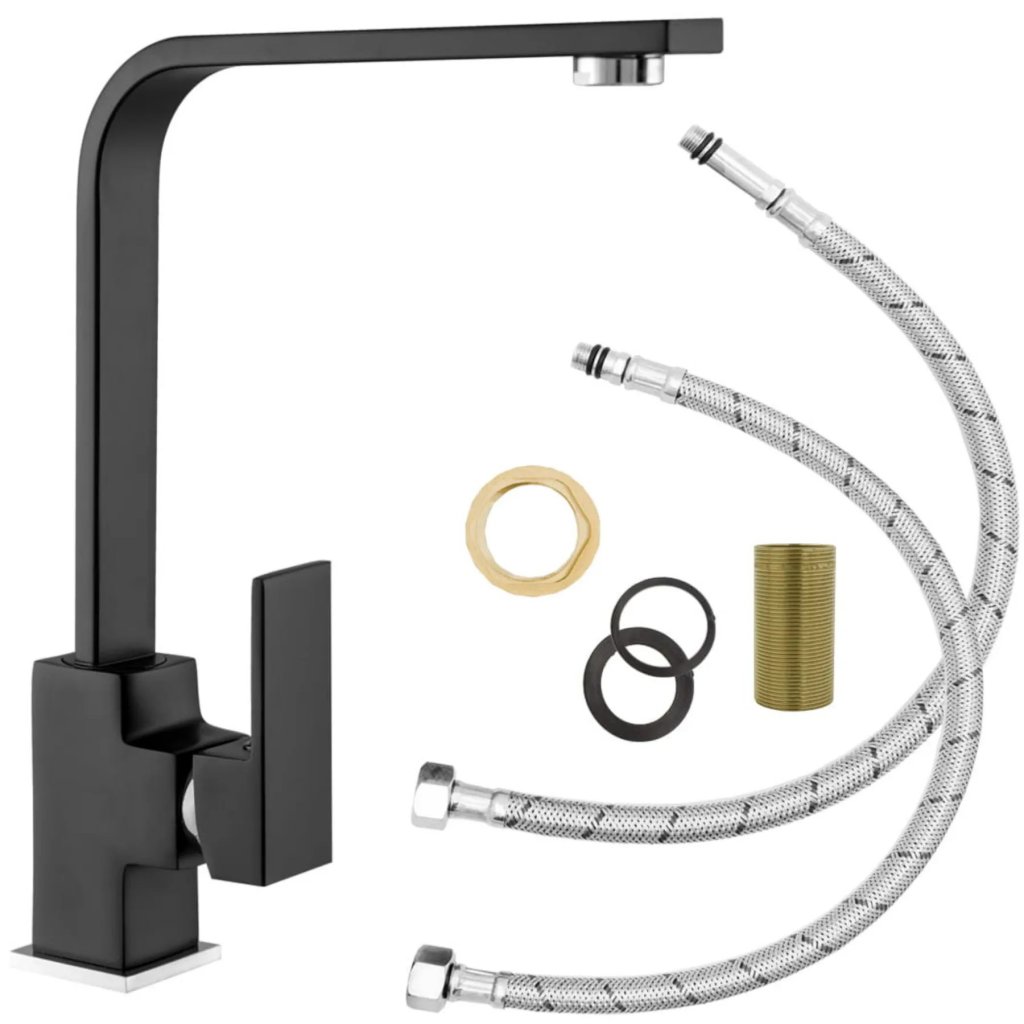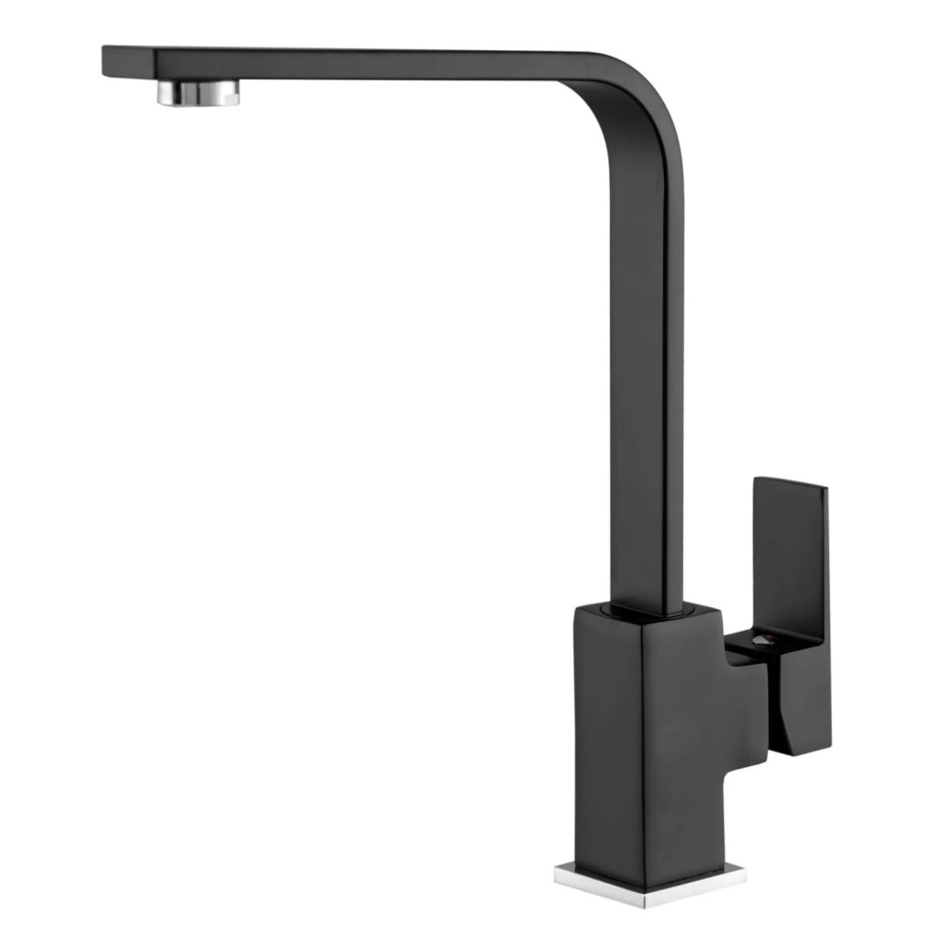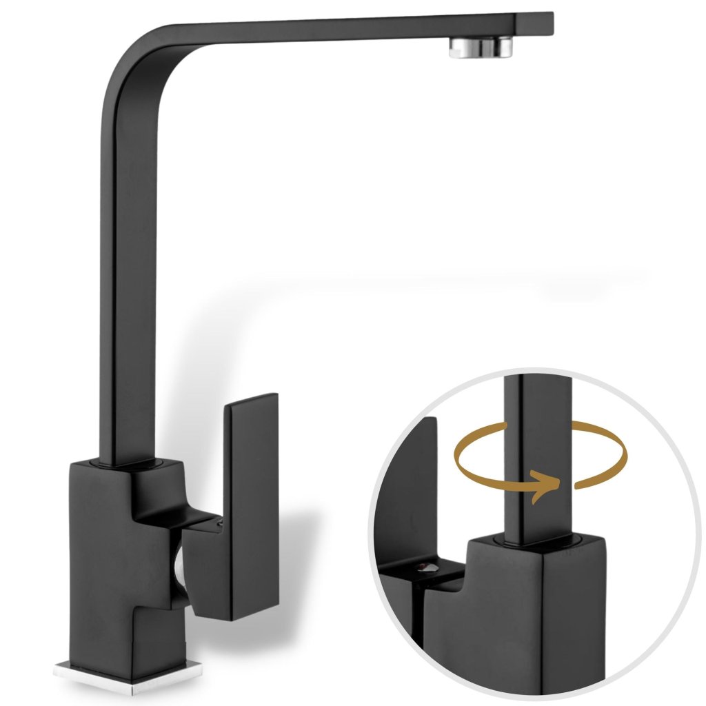 Robinetul de bucătărie negru de designer se potrivește perfect cu culoarea chiuvetelor din granit. Corpul din alamă solidă cu finisaj unghiular creează o soluție modernă și durabilă pentru o bucătărie elegantă.