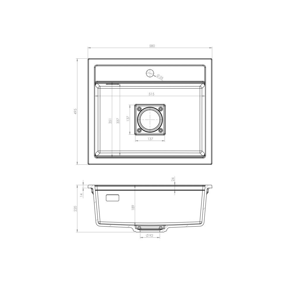Chiuveta de bucătărie are o gaură tăiată din fabrică pentru baterie. În plus, produsul are o gaură de scurgere pentru dopul sifonului (diametru 90 mm) și o gaură de preaplin. Acest lucru face instalarea rapidă și nu necesită echipament profesional. Dacă este necesar, găuriți o gaură pentru dozatorul de detergent folosind un burghiu diamantat cu un diametru de 35 mm.