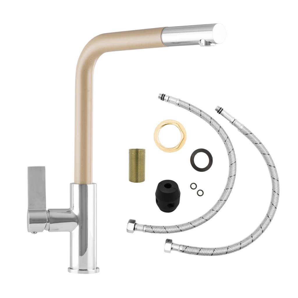 Setul contine toate elementele necesare instalarii unei baterii de bucatarie. Poți monta robinetul în chiuvetă sau pe blat. Are o conexiune standard de 35 mm, potrivita pentru majoritatea chiuvetelor de pe piata.