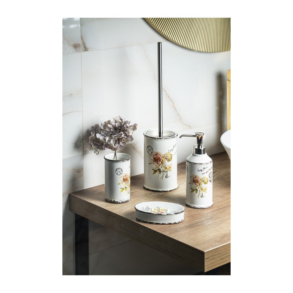Decorul floral delicat și designul care arată ca recipientele de tablă ale accesoriilor de baie din ceramică CLOTHILDE vor încânta într-o baie decorată în stil retro.
