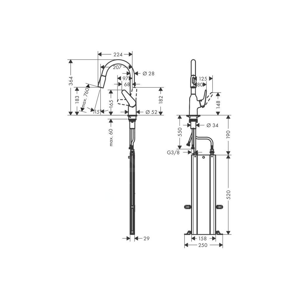 - furtunul poate fi extins până la 76 cm și garantează o muncă plăcută și libertate de mișcare în jurul chiuvetei