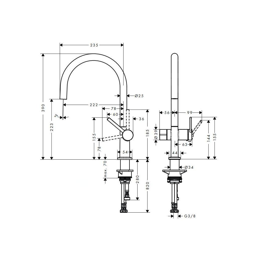 Robinetul de chiuvetă Hansgrohe Talis este dominat de curbe rotunjite și linii elegante și curate. Corpul ei subțire arată atractiv și decent. Aspectul placut al bateriei de bucatarie este sporit de aspectul modern al inoxului. Aduce un design atemporal și confortabil în interiorul bucătăriei. Are 390 mm înălțime. Puteți turna apă într-o vază înaltă sau într-o oală mare. Zona sa de confort este de 223 mm. Robinetul de bucătărie hansgrohe Talis este rotativ în 4 poziții - 60°, 110°, 150° sau 360°. Într-un minut, prin ea vor curge 9 litri de apă. Prin urmare, aparține bateriilor de chiuvetă mai economice. În interiorul bateriei există un cartuş ceramic de înaltă calitate, care asigură o mişcare lină şi lină a pârghiei bateriei. Acest robinet de bucătărie include o supapă de închidere pentru aparat.