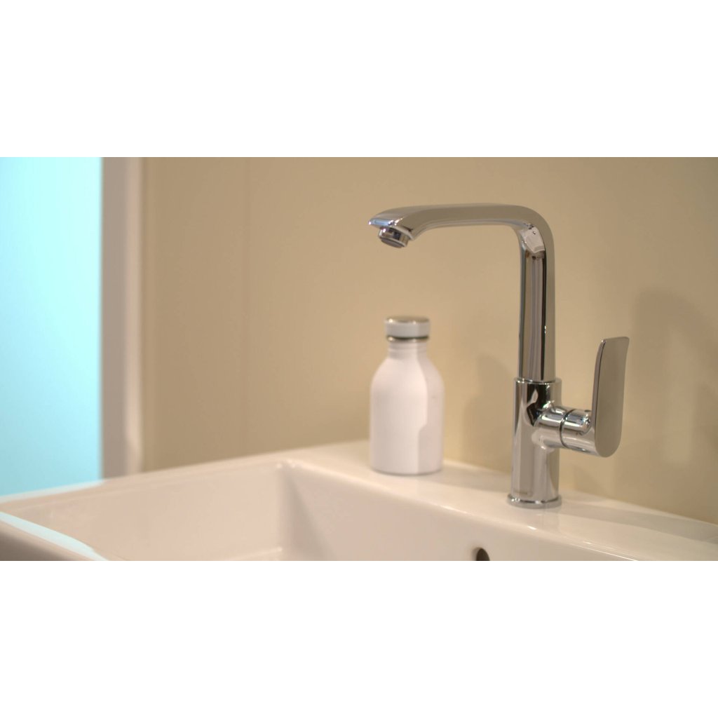 Bucurați-vă de o zonă de confort extinsă în baia dvs. și de sunetul blând al fluxului de apă al bateriei de lavoar hansgrohe Metris 230 cu un set de scurgere cu tragere.