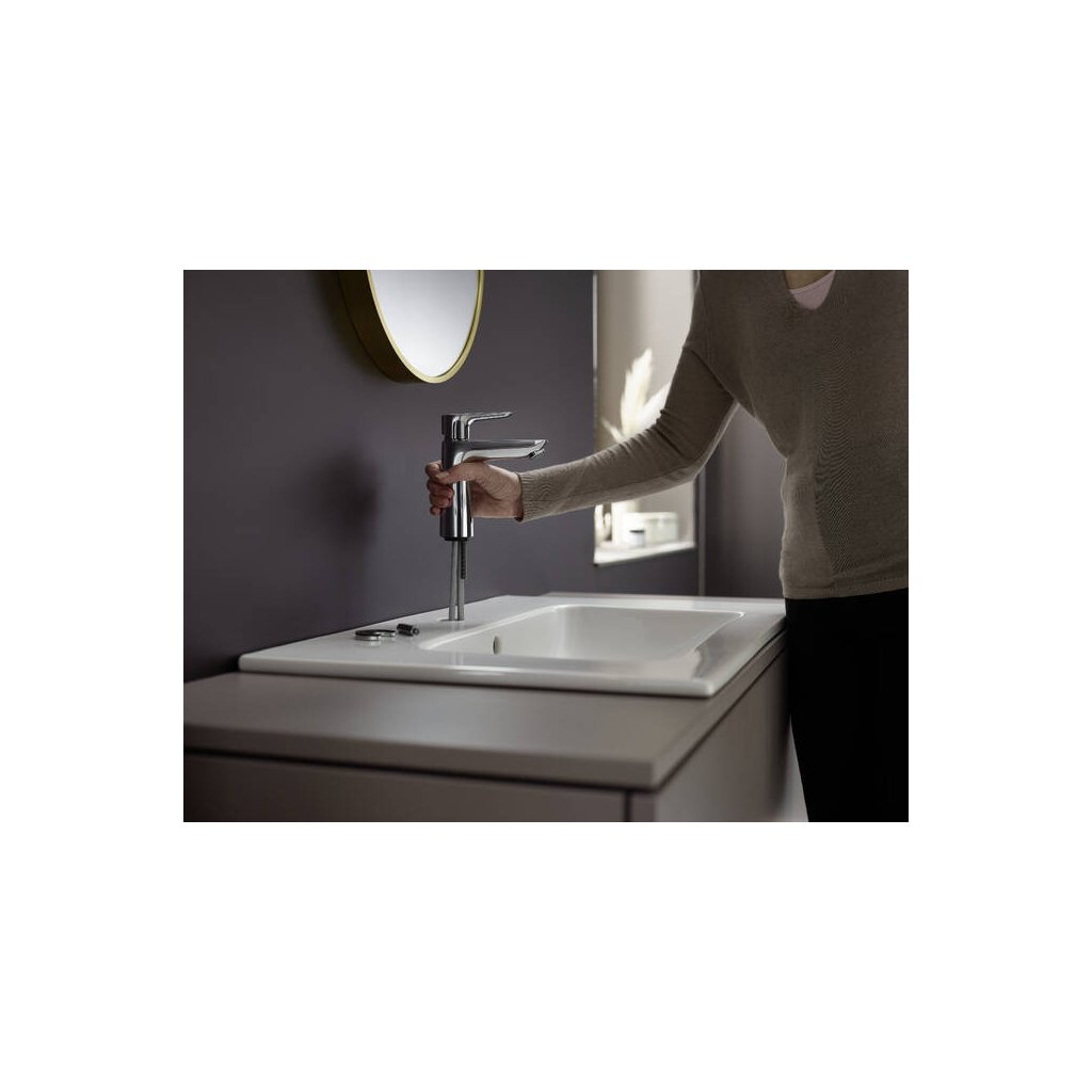 Pe lângă designul său uimitor, robinetul pentru chiuvetă Hansgrohe Talis E oferă și o serie de funcții practice care fac să fie plăcut gestionarea apei în baie. Robinetul de la chiuveta are un corp neted, ale carui linii ies in evidenta datorita suprafetelor cromate lucioase. Datorită tratamentului special al suprafeței, le puteți păstra cu ușurință curate . Sunt foarte rezistente la deteriorări mecanice , dar reduc și riscul depunerilor de calcar și murdărie. Datorită ComfortZone 110, poți fi sigur și că apa care iese din gura de scurgere nu va stropi pe marginea chiuvetei. Cu siguranta vei aprecia reglarea sensibila a temperaturii si a intensitatii curentului prin intermediul unei manete metalice. În spatele funcționării lin se află un cartuş ceramic care previne săriturile neplăcute. Avantajul este și posibilitatea limitării reglabile a temperaturii , datorită căreia puteți reduce riscul de opărire și, de asemenea, puteți menține sub control costurile cu apă caldă. Robinetul include un kit de scurgere Push-Open.
