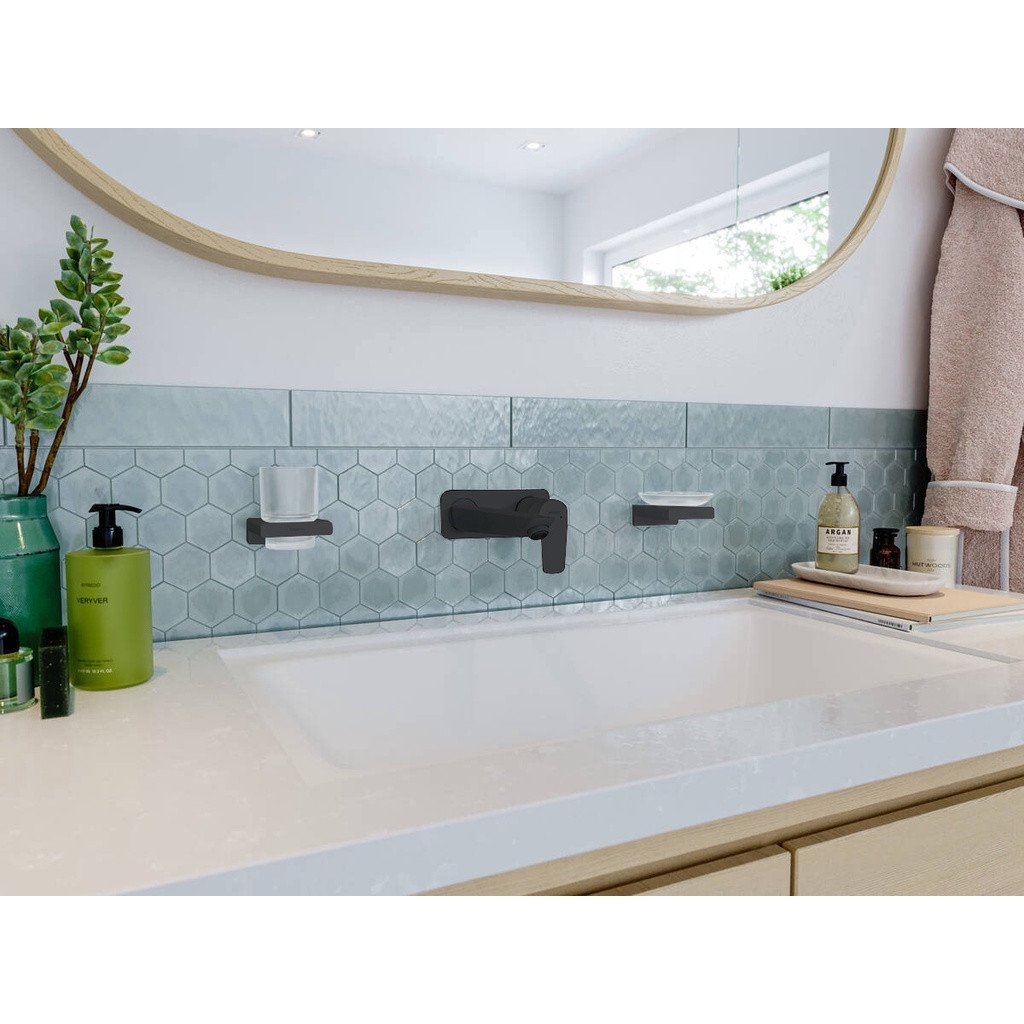 - Include: set de scurgere, baterie de lavoar cu manetă, pentru montare pe perete