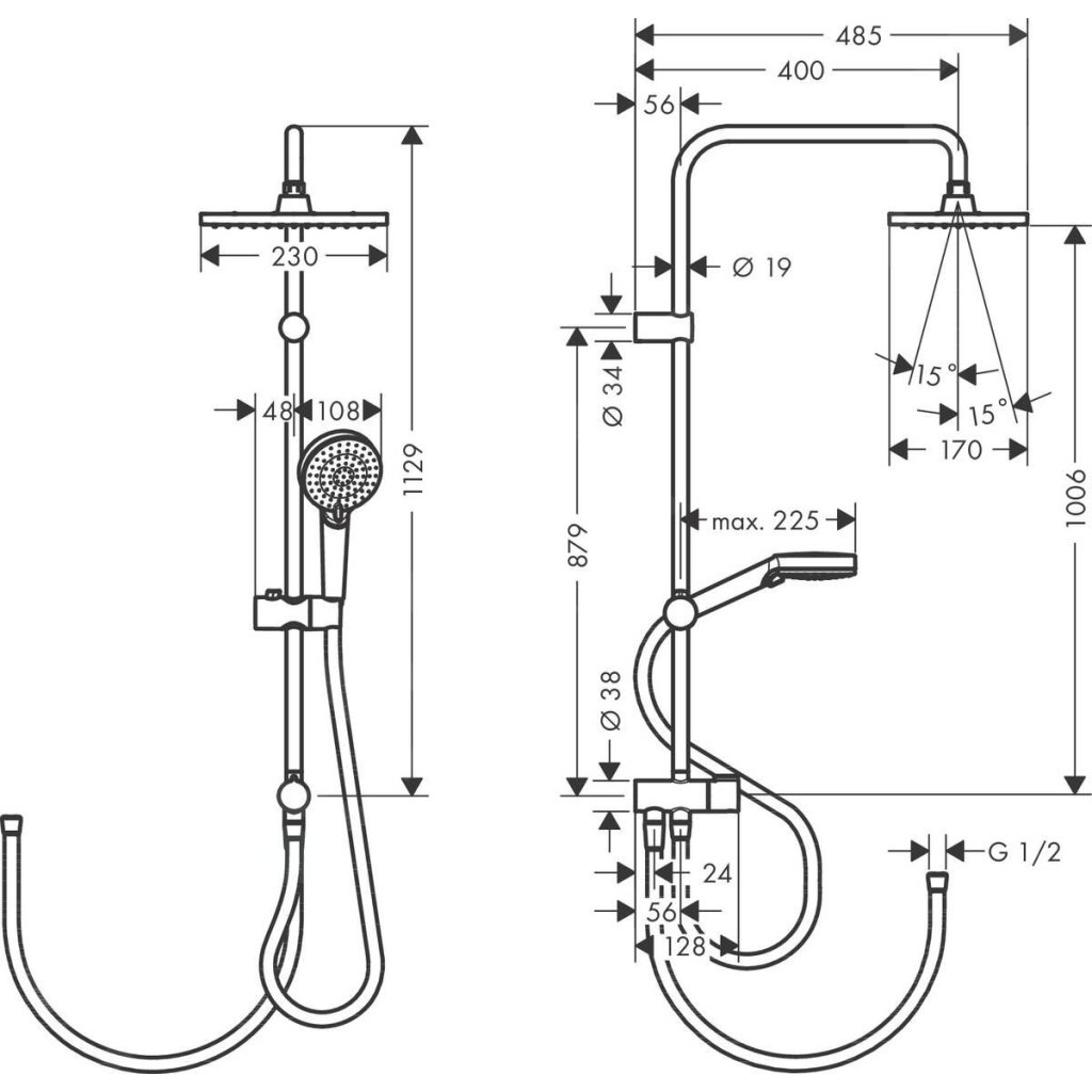 Setul de duș montat pe perete Showerpipe 230 pentru renovare include
