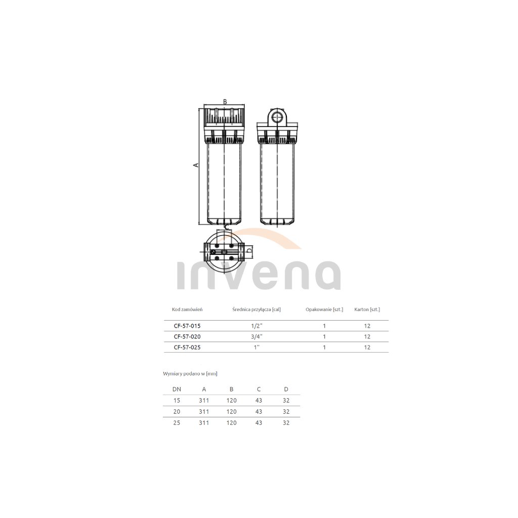 Invena, corp filtru din 2 piese 1/2", INV-CF-57-015-G
