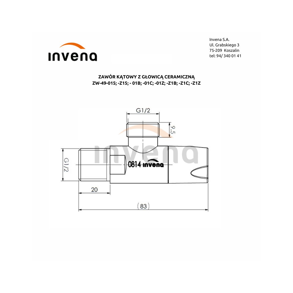 Invena, supapă unghiulară cu cap ceramic 1/2" X 1/2", alb mat, INV-ZW-49-01B-W