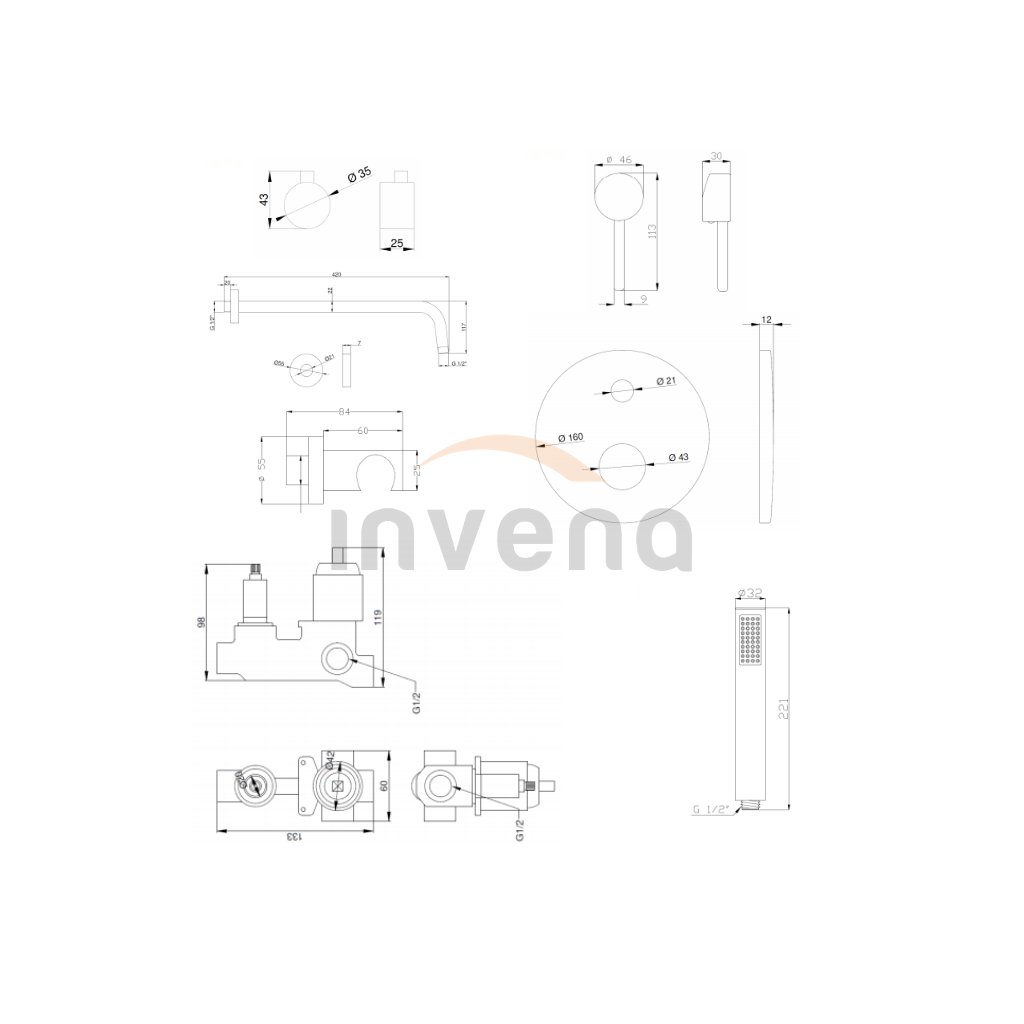 Invena Dafni, set de dus ascuns cu cap de dus cu efect de ploaie 25 cm, crom lucios, INV-BS-88-0O2-A