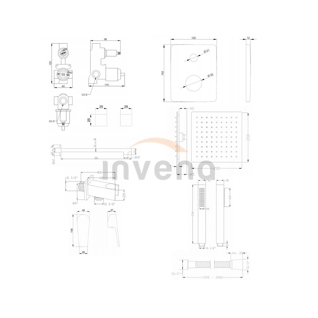 - Duș cu ploaie superioară: pătrat 20 x 20 cm, ABS, sistem Anti-Calc