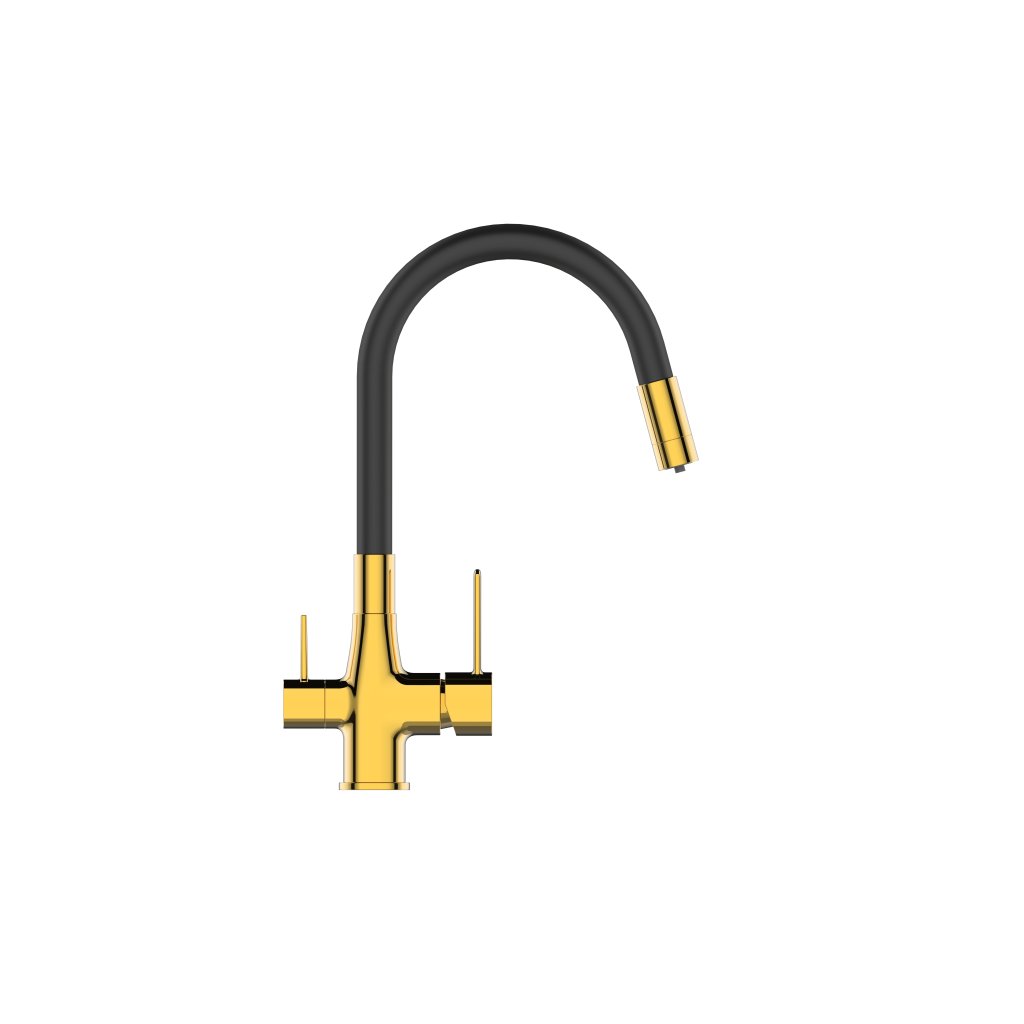Invena Magic, baterie pentru chiuvetă de sine stătătoare cu braț flexibil și filtru de apă potabilă, negru-auriu lucios, INV-BZ-08-F09-V