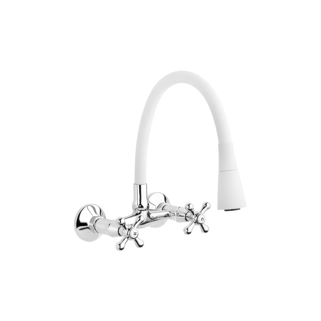 Robinetul de perete Roma este o propunere pentru persoanele care caută o combinație de funcționalitate cu un design unic. Bateria este prevazuta cu o duza elastica, care permite spalarea vaselor de diferite dimensiuni si in acelasi timp limiteaza stropirea cu apa in lateral. Combinația de gura albă cu mânere cromate se va potrivi practic oricărei bucătării.