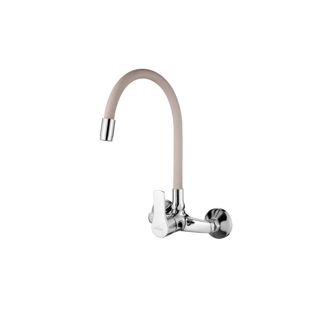 Robinetul bej este o soluție ideală pentru încăperile decorate în culori luminoase care au instalații sanitare montate pe perete. Este echipat cu o duză flexibilă cu un braț de memorie modelabil și oferă confort atunci când spălați vase de diferite dimensiuni. Pârghia bateriei este situată în mijloc, ceea ce o face o soluție convenabilă atât pentru utilizatorii dreptaci, cât și pentru stângaci.