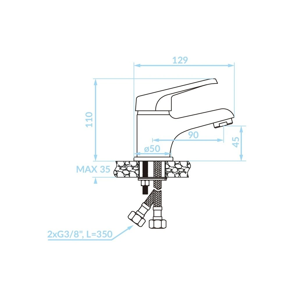 Designul montat pe suport permite instalarea ușoară direct în orificiul bateriei de la chiuvetă. Livrarea include furtunuri de conectare lungi de 35 cm, care asigură flexibilitate la conectarea la sistemul de distribuție.