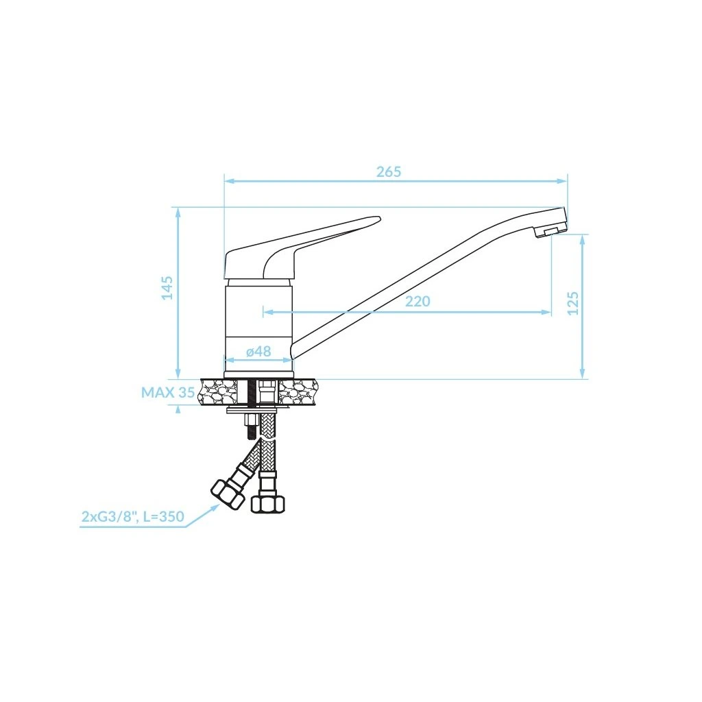 Gura mobilă cu un diametru al capului de 40 mm asigură un debit optim de apă pentru utilizarea zilnică. Sistemul de conectare cu furtunuri de 35 cm permite o instalare flexibilă. Finisajul cromat este rezistent la coroziune și ușor de curățat, păstrându-și strălucirea chiar și după ani de utilizare.
