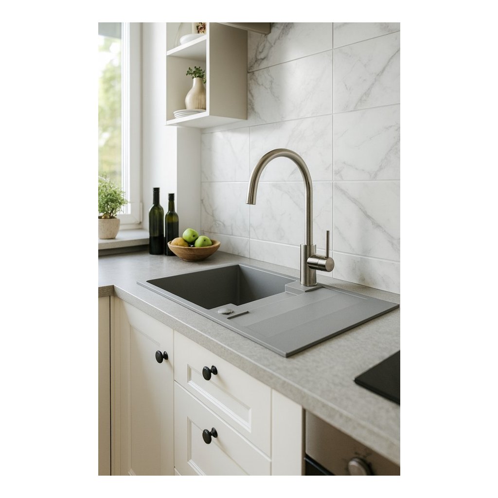 Chiuveta cu o cuvă și scurgător din granit gri din seria RAB este un produs extrem de elegant, cu un design minimalist. Chiuvetele cu o cuvă și scurgător sunt printre cele mai frecvent alese produse pentru bucătăriile de orice dimensiune. Datorită scurgătorului de dimensiuni normale, acestea vor funcționa deosebit de bine în bucătăriile fără mașină de spălat vase. Astfel de chiuvete sunt folosite și ca echipamente pentru bucătăriile de la locul de muncă.