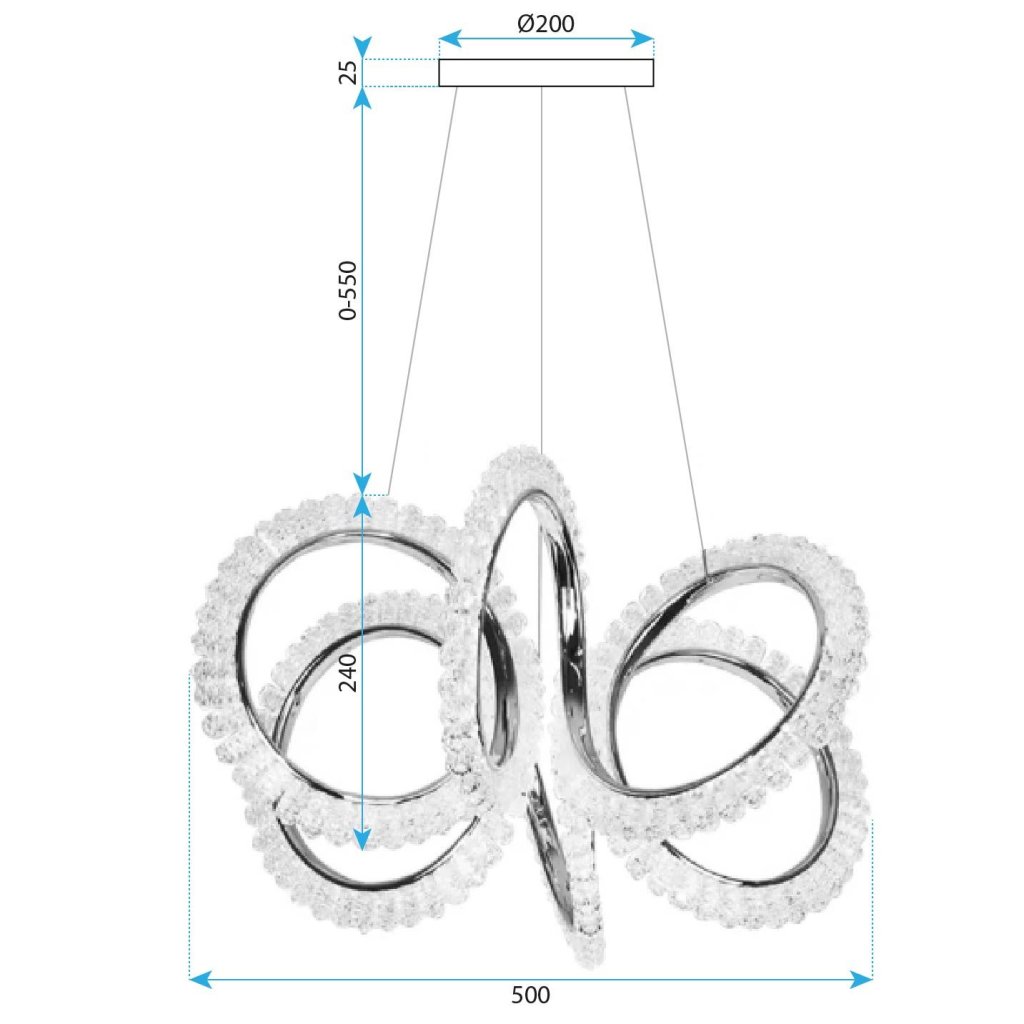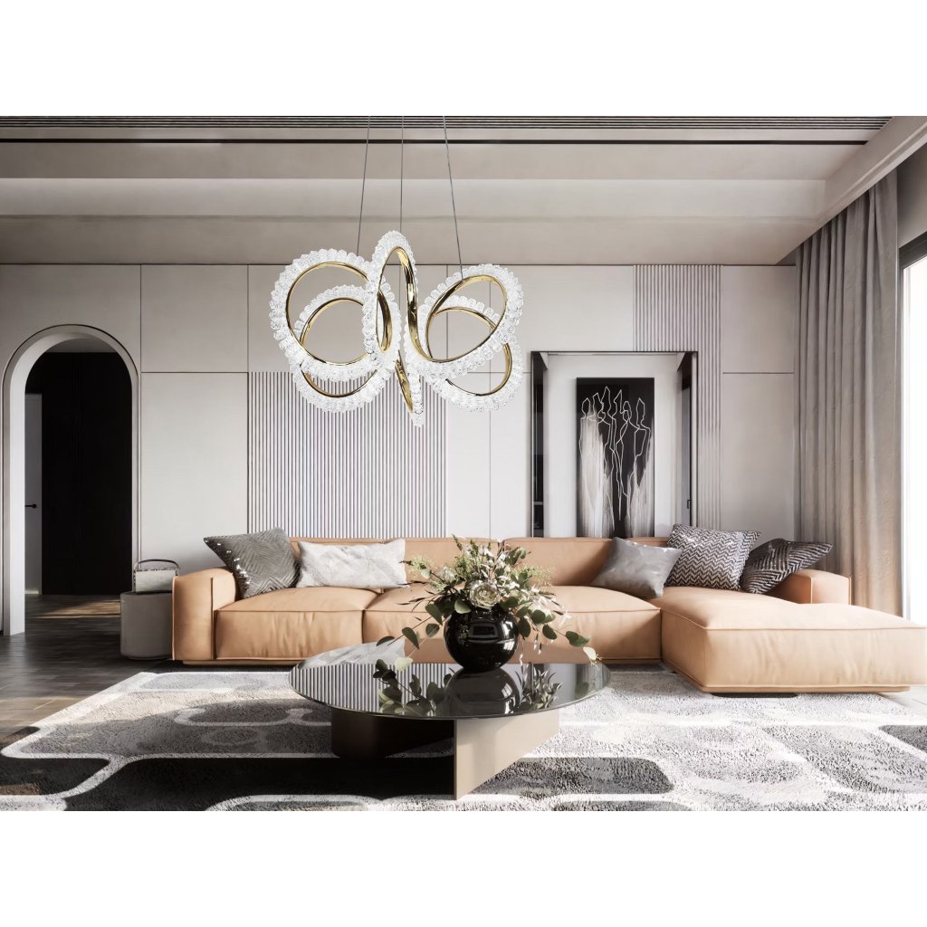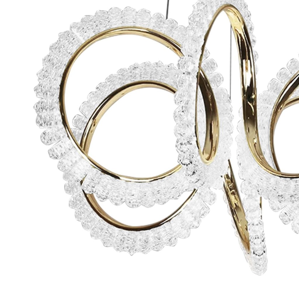 Lampa LED din colecția de candelabre moderne este combinația perfectă între design impresionant și funcționalitate. Forma sa dinamică, bazată pe inele aurii decorate cu cristale transparente, conferă ansamblului un caracter luxos și o strălucire unică. Este un iluminat care atrage atenția și adaugă eleganță interiorului de la prima vedere.