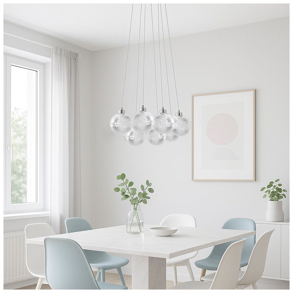 Lampa elegantă cu pandantiv, cu abajururi decorative din acril, este o combinație armonioasă între forma modernă și estetica atemporală. Elementele finisate cu grijă difuzează ușor lumina și aduc o atmosferă caldă și atmosferică în interior. Este o alegere excelentă ca punct focal în sufragerie, sufragerie, deasupra unei mese sau într-un hol spațios. Datorită posibilității de a regla lungimea cablurilor, înălțimea suspensiei poate fi ușor adaptată la natura și dimensiunile camerei. Detaliile cromate subliniază stilul modern al lămpii, făcând-o nu doar o parte eficientă, ci și funcțională a echipamentului.