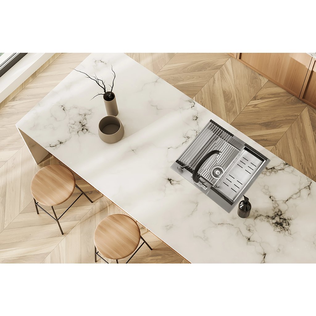 - Instalare încastrată – Chiuveta este plasată la același nivel cu suprafața blatului de lucru, creând o linie unică ce conferă bucătăriei un aspect modern. Marginea din jurul chiuvetei este protejată cu silicon, care asigură o scurgere eficientă a apei în scurgere.