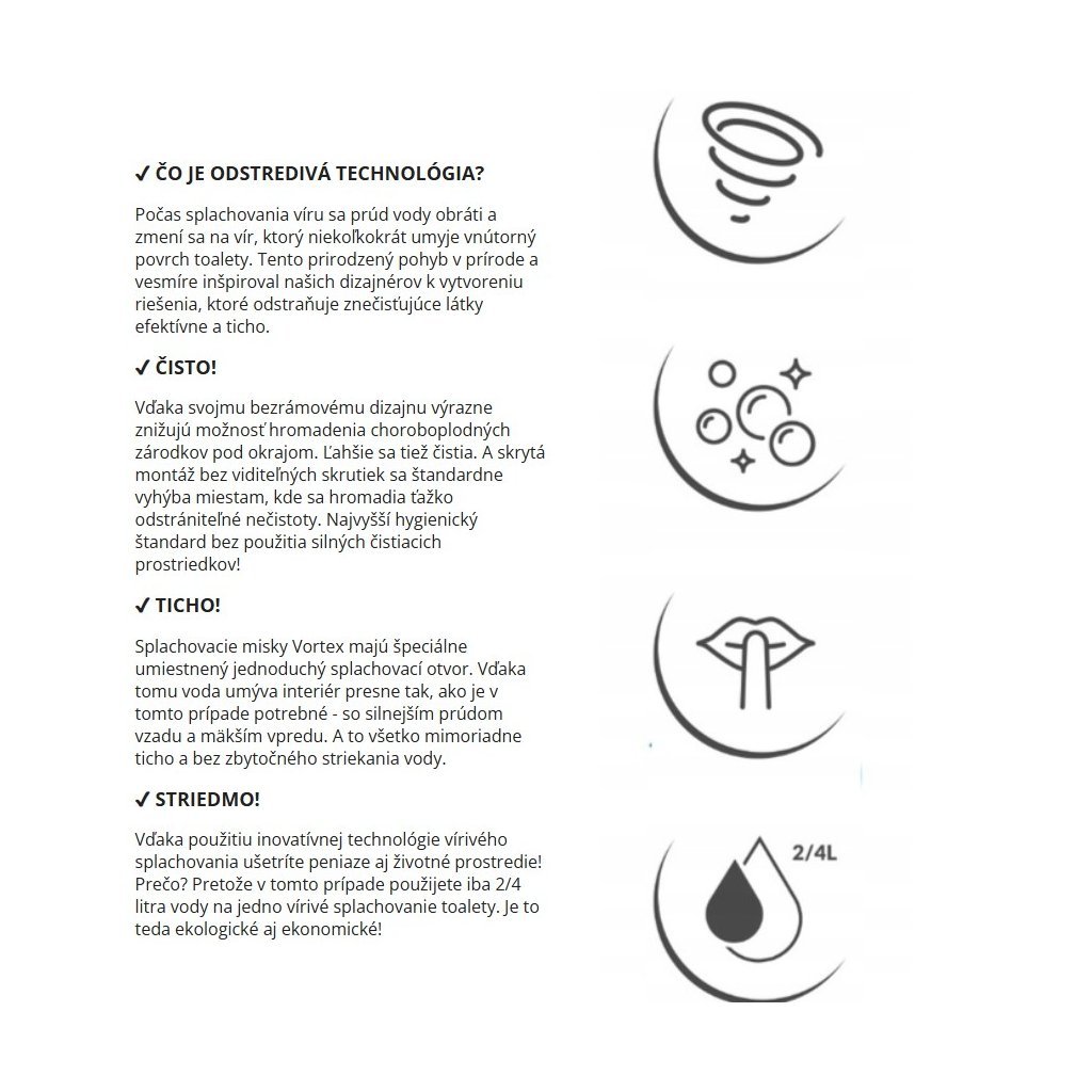 ➡️ Toaletă suspendată cu tehnologie inovatoare de spălare CycleOn Vortex, care utilizează un jet puternic de apă. Testele independente au arătat că această nouă metodă de spălare curăță perfect interiorul vasului de toaletă, folosind doar 2 sau 4 litri de apă.