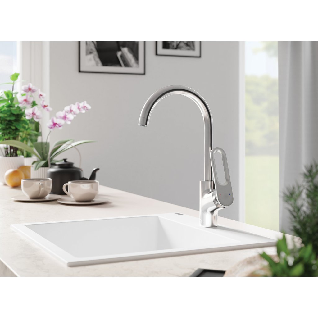 Robinetul de chiuvetă cromat Tierra este o soluție clasică care se potrivește perfect în orice bucătărie. Duza în formă de U este finisată cu un aerator Neoperl, care aerisește fluxul de apă și reduce consumul de apă. In plus, este dotata cu un sistem anticalcar care faciliteaza indepartarea depunerilor. Funcționarea lină a bateriei este posibilă datorită manetei joystick-ului cu un orificiu care face mai ușoară eliberarea apei chiar și cu mâinile ude.