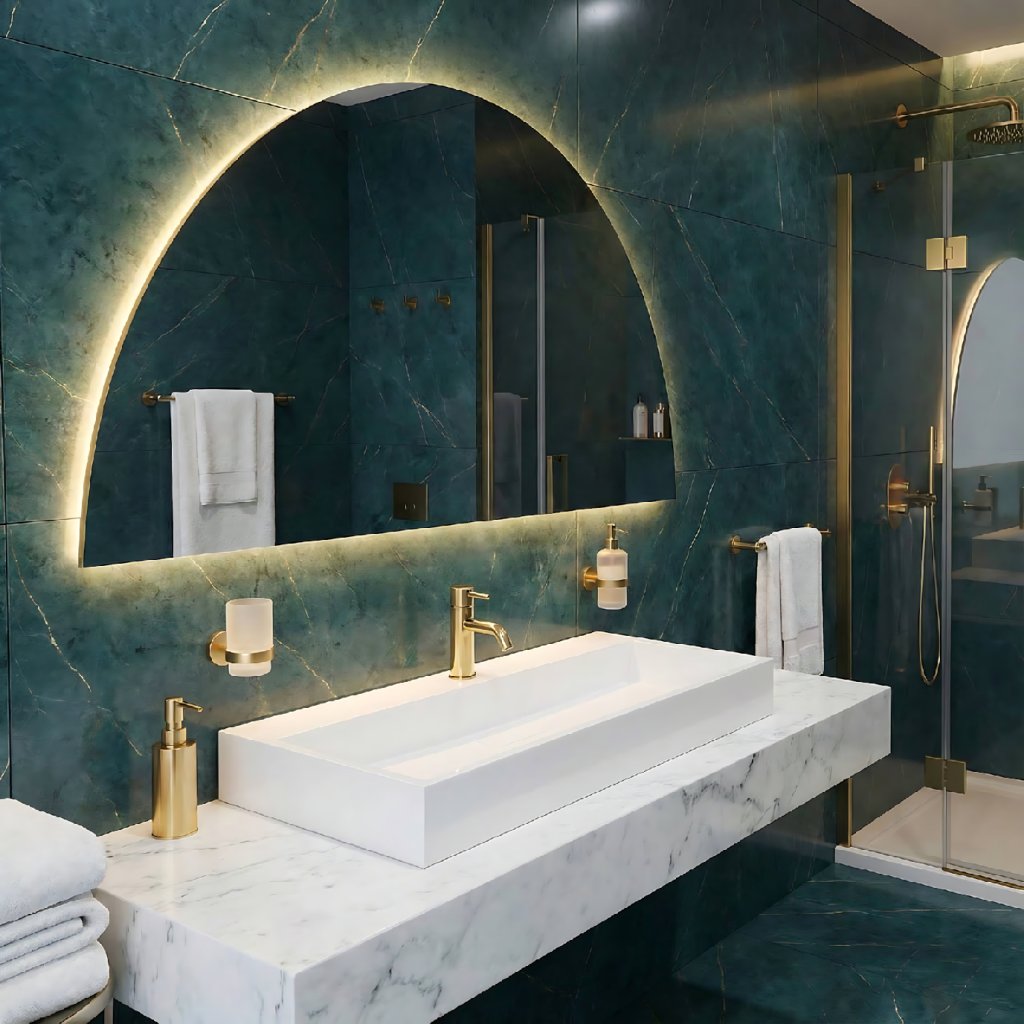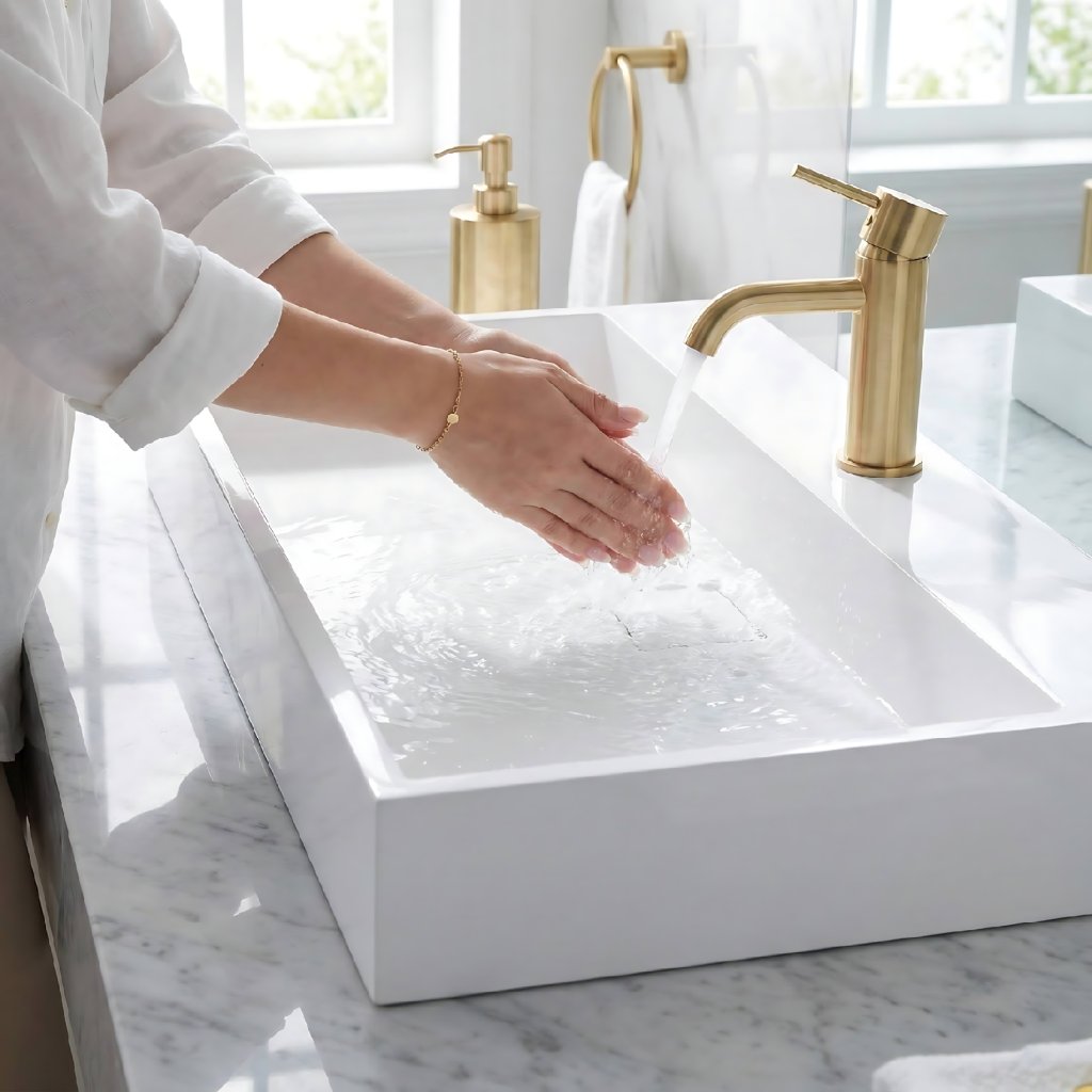 Opțiunea de montare pe blat sau pe perete oferă flexibilitate în designul băii.