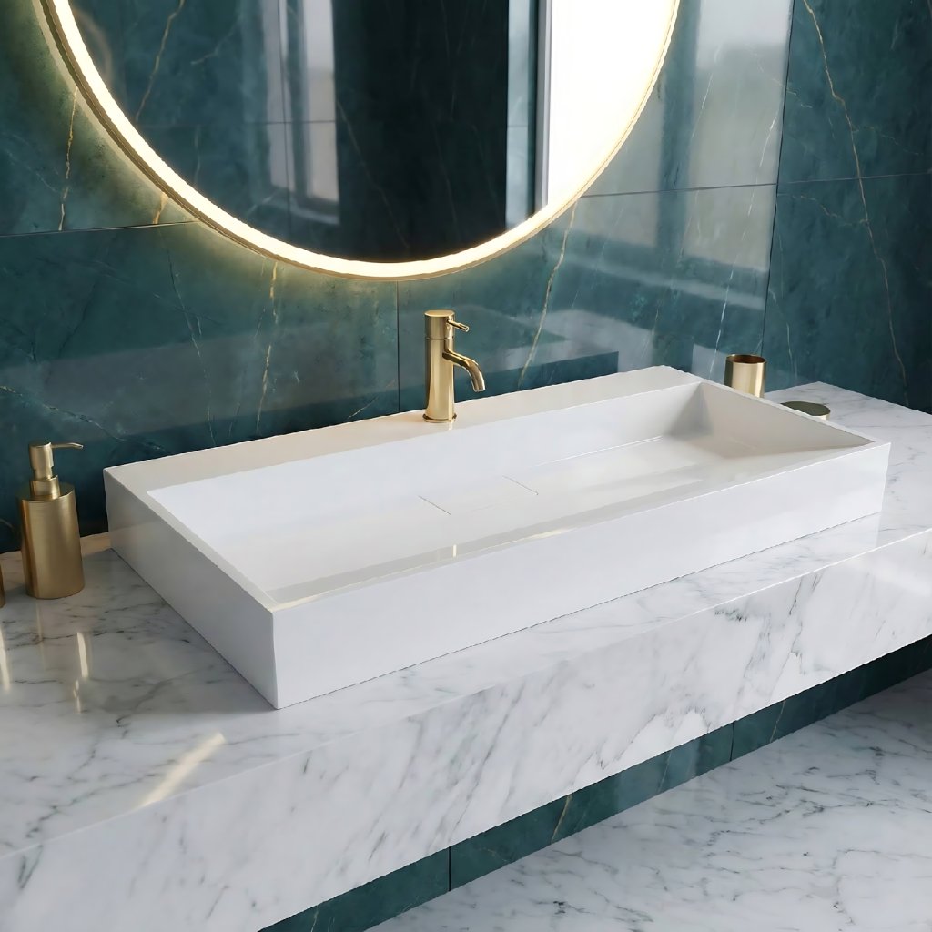 Lavoarul de blat elegant și modern Rea Goya, cu o lungime de 100 cm, se remarcă prin forma sa armonioasă, calitatea superioară a lucrării și designul atemporal. Este fabricat din conglomerat solid, care combină aspectul estetic cu durabilitatea ridicată. Lavoarul poate fi așezat pe blatul de baie sau agățat pe perete, ceea ce permite nu numai o proiectare flexibilă a soluției spațiale, ci și o integrare ușoară într-o baie modernă.