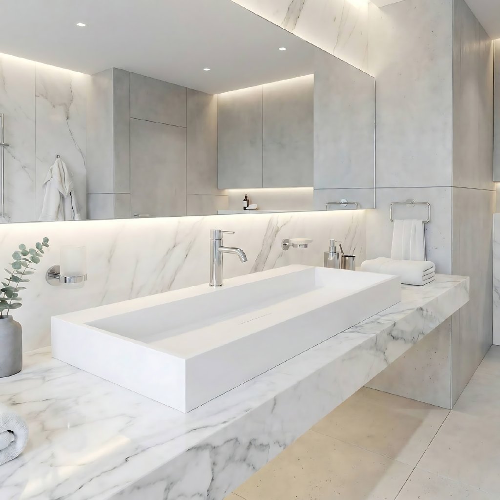 Conglomeratul alb arată elegant, modern și mărește vizual spațiul.