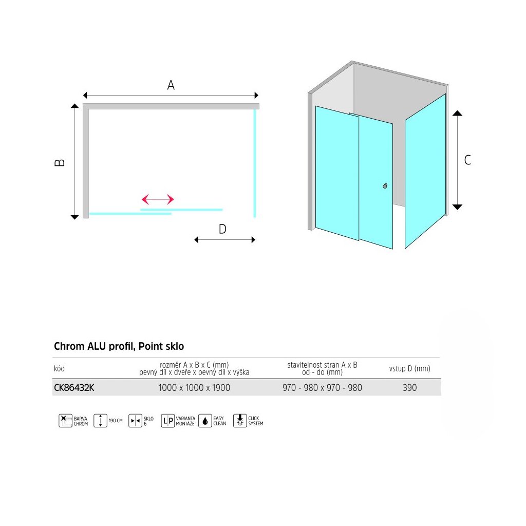 Mereo, Cabină de duș, LIMA, pătrată, 100 x 100 cm, crom ALU, sticlă Point, MER-CK86432K
