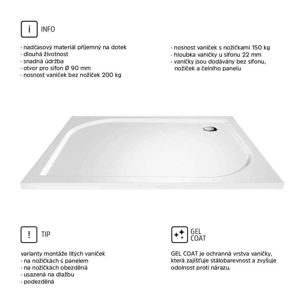 Căzile de duș sunt o parte esențială a cabinelor de duș, iar prin designul și calitatea prelucrării lor, pot afecta în mod semnificativ impresia de ansamblu a cabinei de duș.Căzile de duș din marmură turnată sunt prevăzute cu un strat protector Gelcoat, care asigură rezistența culorii și rezistența la impact.