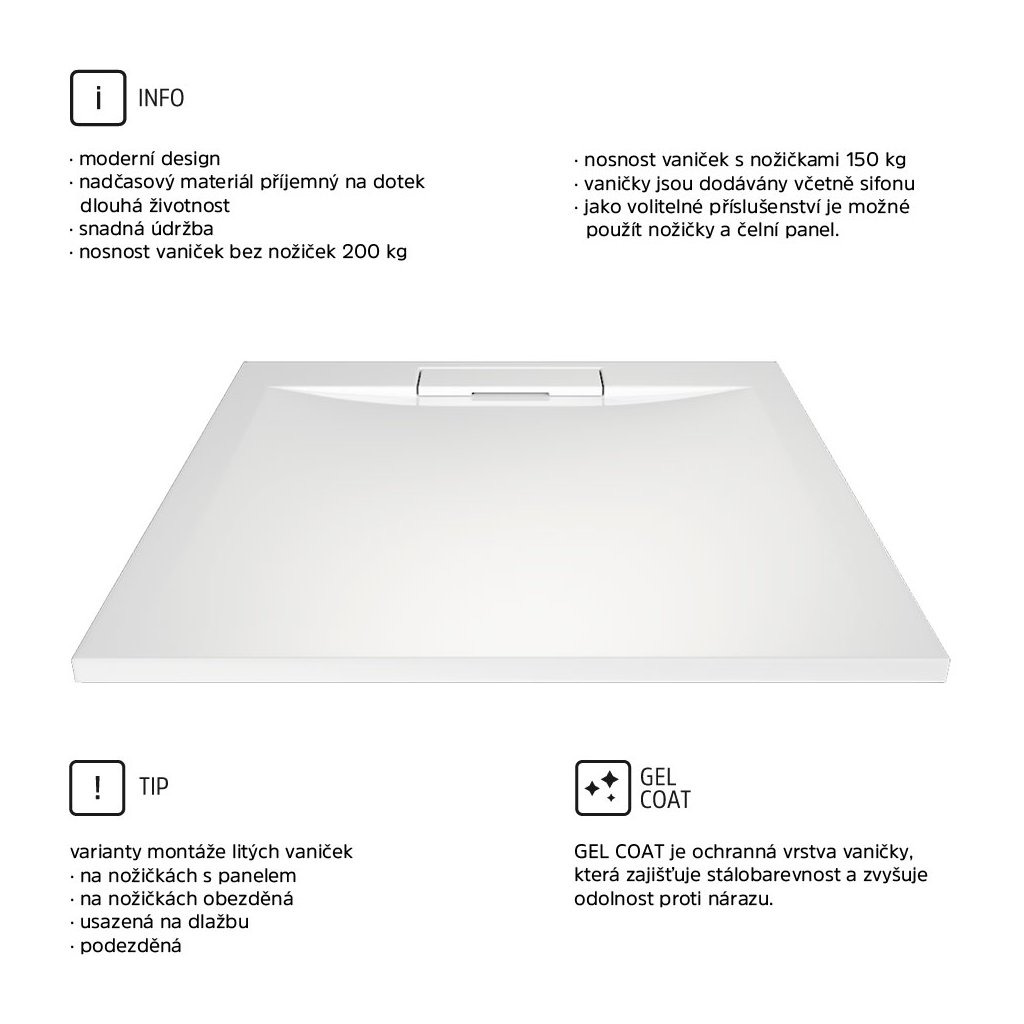 Căzile de duș sunt o parte esențială a cabinelor de duș, iar prin designul și calitatea prelucrării lor, pot afecta în mod semnificativ impresia de ansamblu a cabinei de duș.Căzile de duș din marmură turnată sunt prevăzute cu un strat protector Gelcoat, care asigură rezistența culorii și rezistența la impact.
