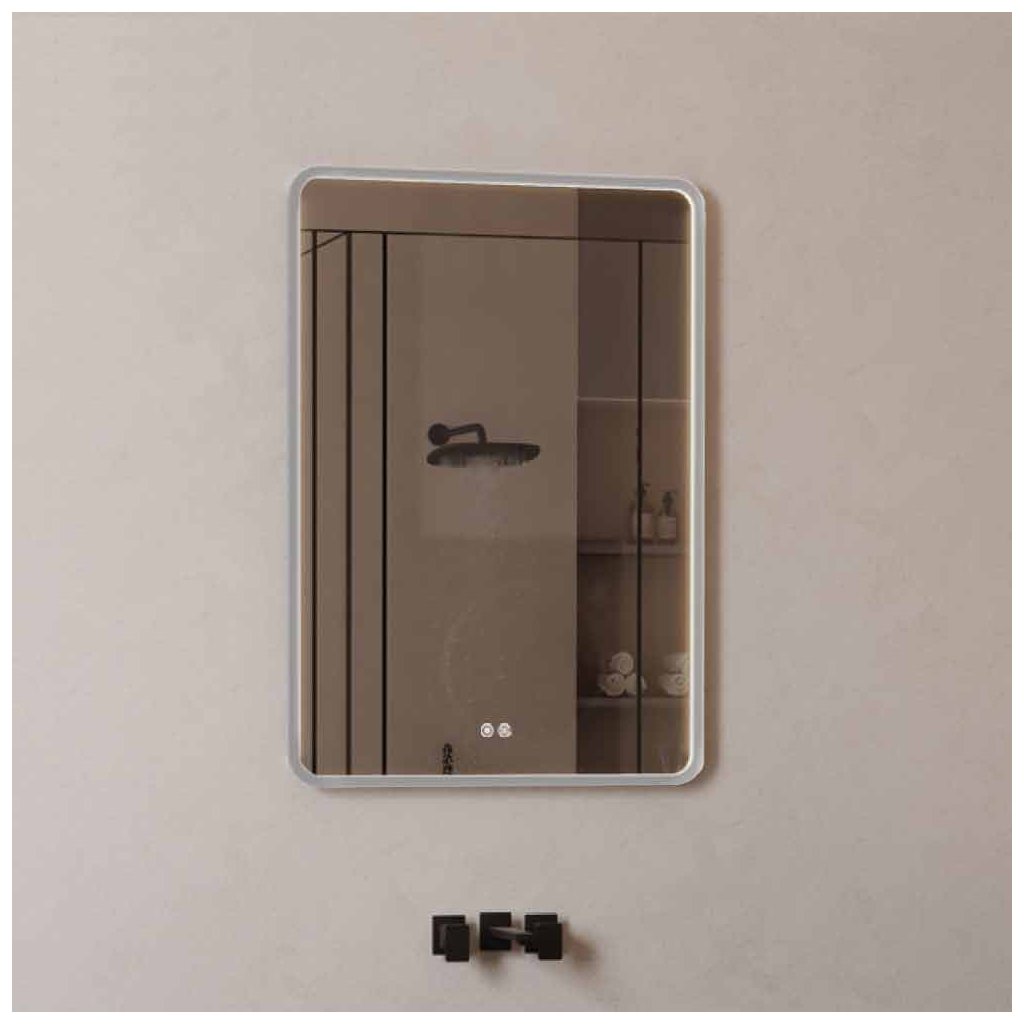 Oglindă elegantă cu iluminare LED. Oglinda este activată de un senzor tactil situat în partea frontală inferioară a oglinzii. Oglinda este echipată cu suporturi (agățare și cârlige de perete adecvate) pentru agățare verticală. Pentru oglinzile cu iluminare, recomandăm plasarea prizei „în centrul oglinzii”. Lungimea cablului de alimentare este de 0,8 m, permițând o instalare convenabilă.