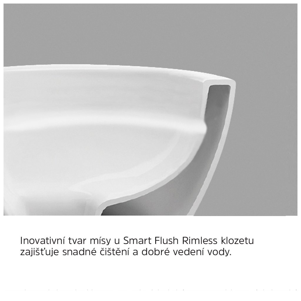 Rimless este o modalitate inovatoare de a spăla vasul de toaletă. Modul bine gândit de a conduce apa asigură spălarea eficientă a toaletei și, de asemenea, curățarea ușoară a vasului de toaletă.Datorită noii forme a vasului, nu este necesară curățarea canelurii de spălare de sub marginea vasului, care se folosește la toaletele clasice și unde s-ar putea acumula bacterii, murdărie și depuneri.