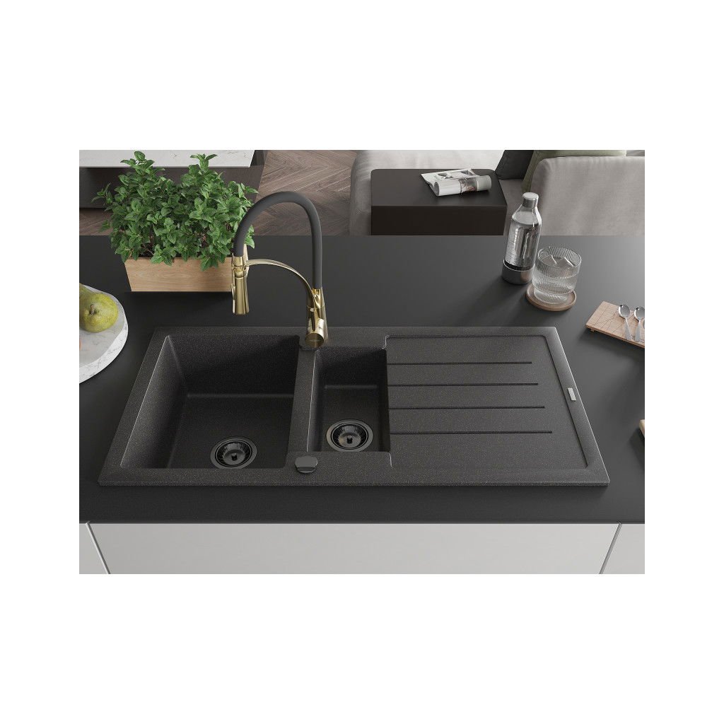 Mexen Andres, chiuveta granit cu 1,5 camere 1000x500x200 mm si baterie pentru chiuveta Aster, pete negre, 6515-76-73450-57-B