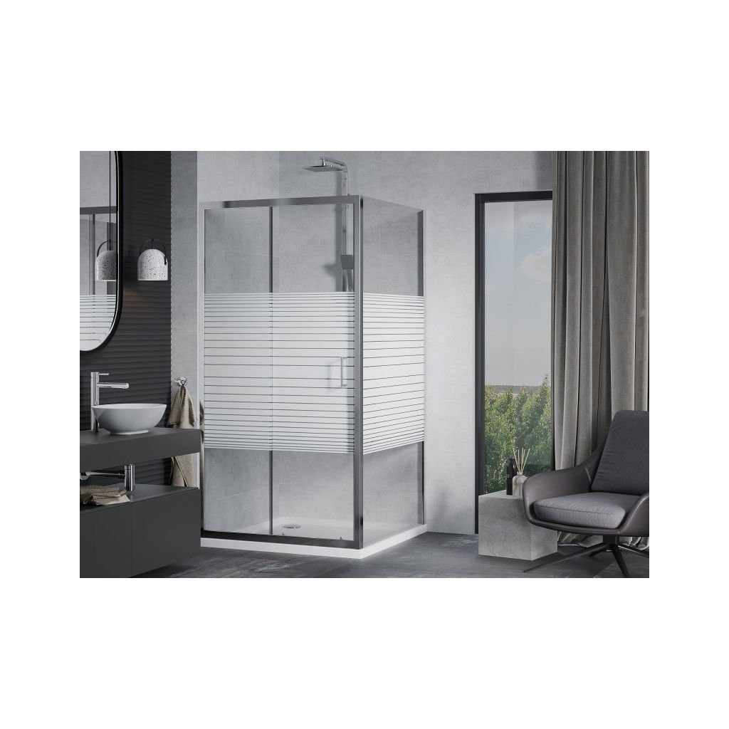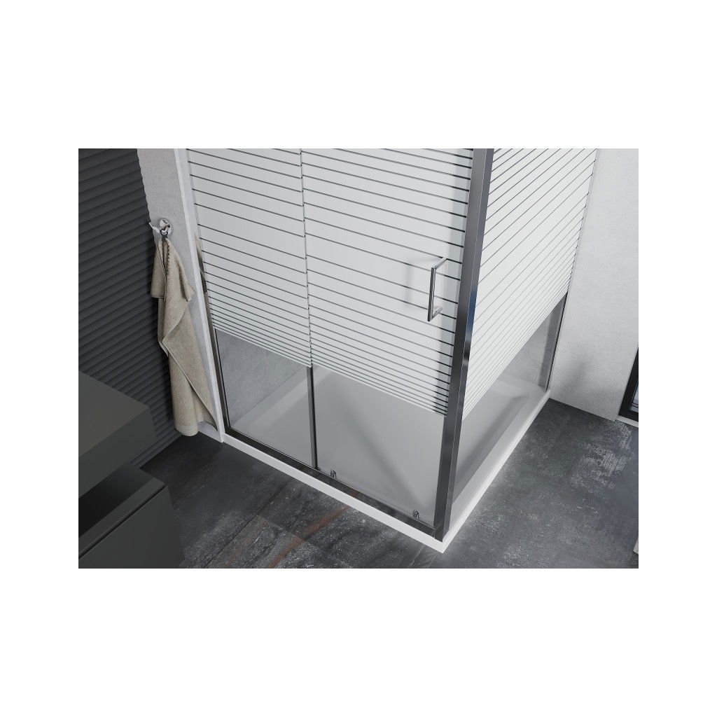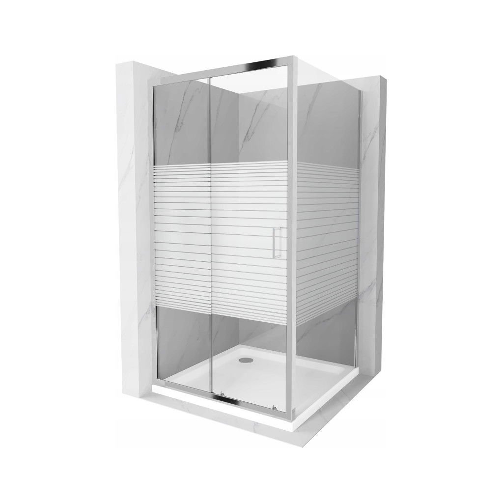 Mexen Apia, cabină de duș cu ușă glisantă 100 (uşă) x 100 (perete) cm, sticlă cu dungi incolore 6 mm, profil cromat + cadă de duș subțire 5 cm, 840-100-100-01-20-4010