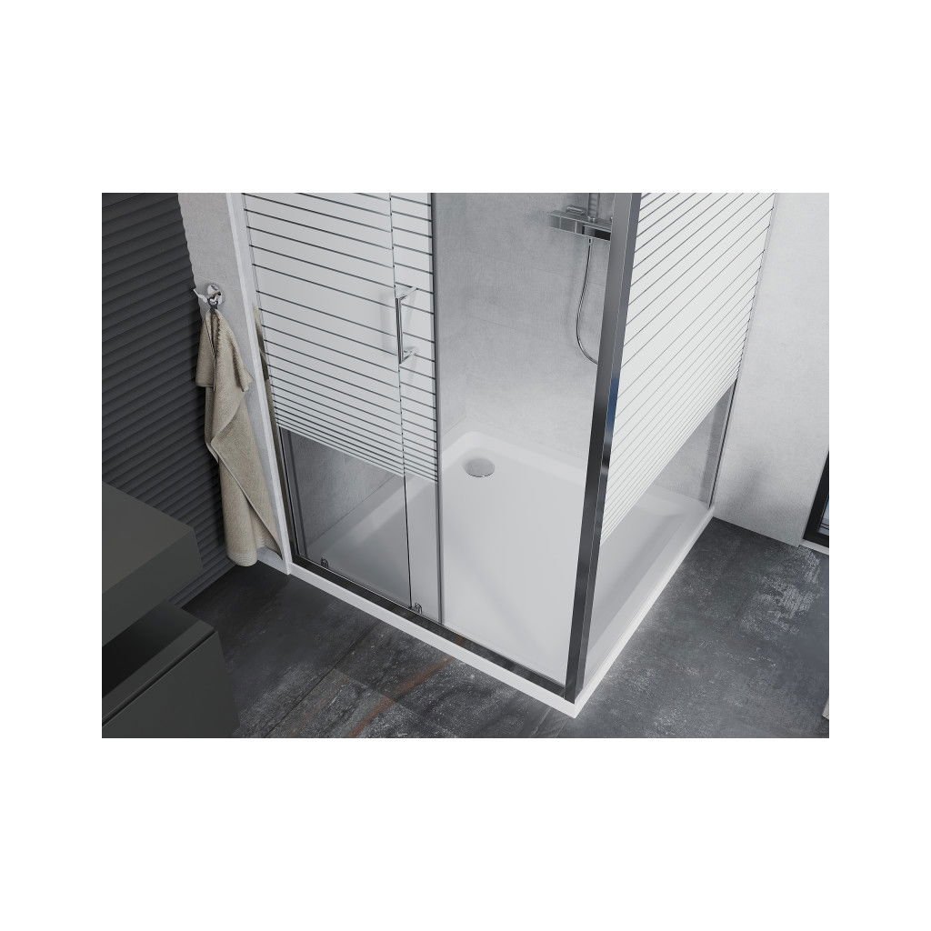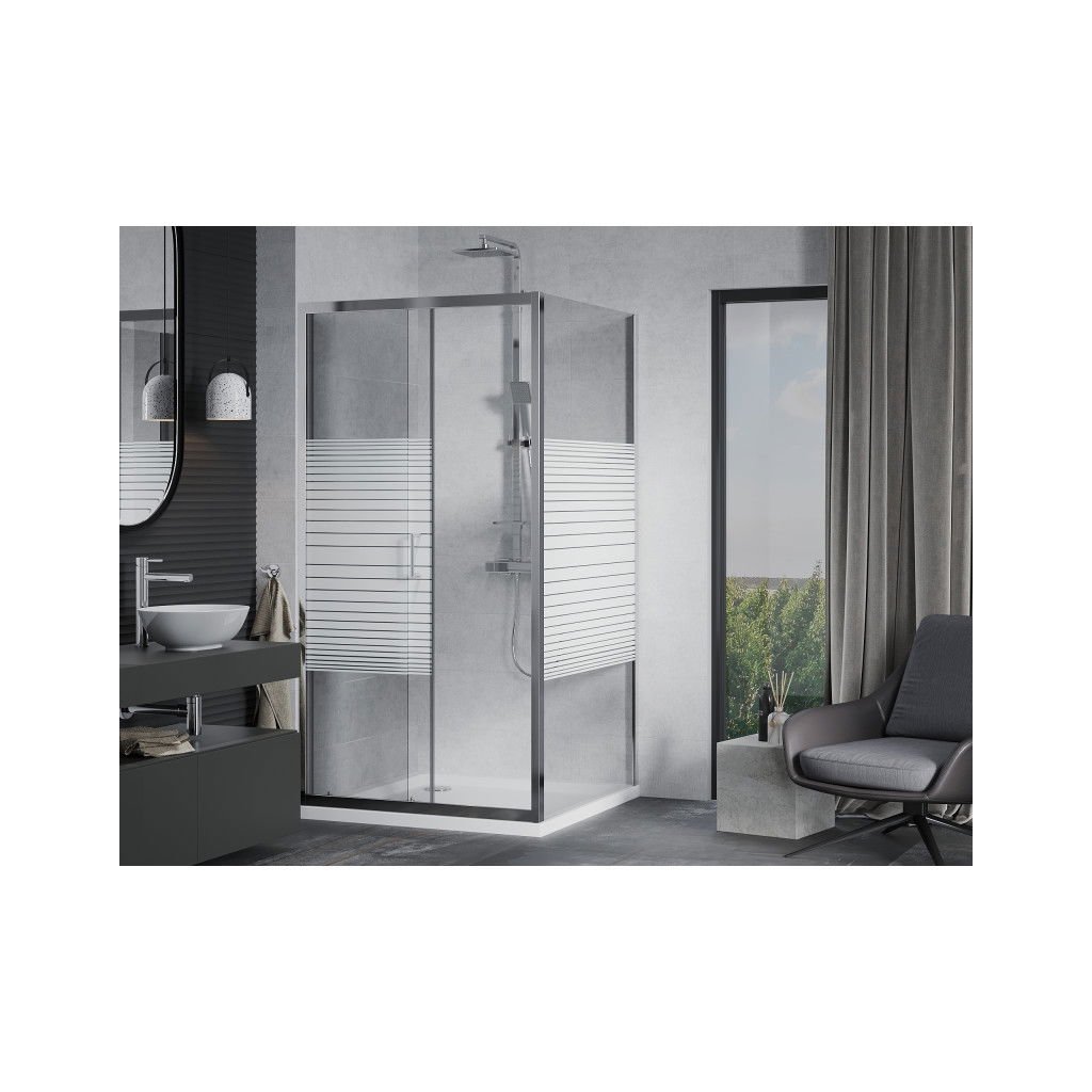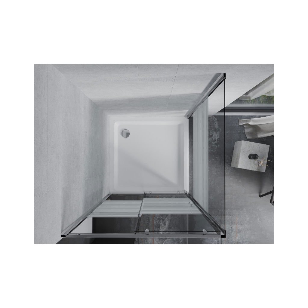 Mexen Apia, cabină de duș cu ușă glisantă 100 (uşă) x 100 (perete) cm, sticlă cu dungi incolore 6 mm, profil cromat + cadă de duș subțire 5 cm, 840-100-100-01-20-4010