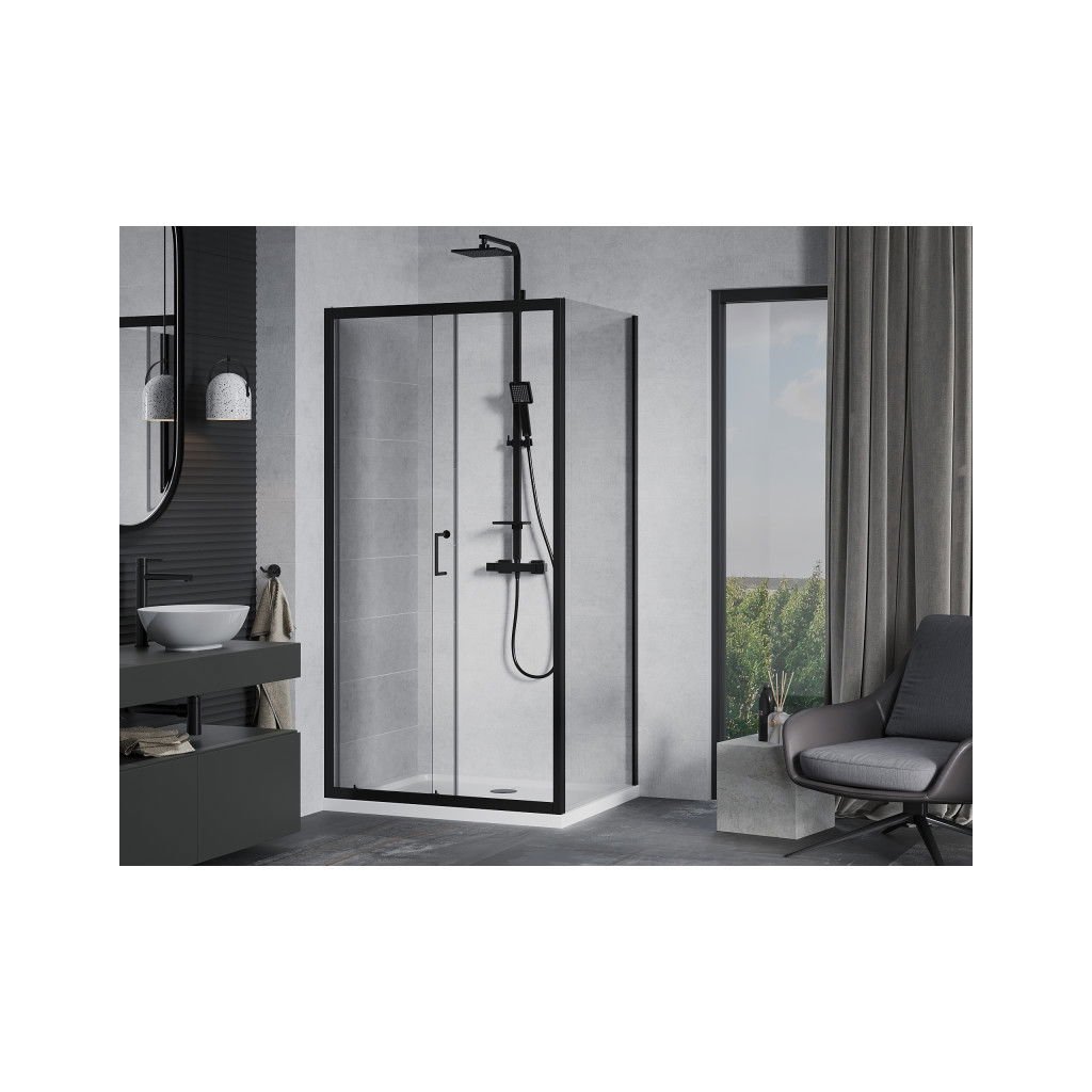 Dușul din seria Mexen Apia este o alegere excelentă realizată din sticlă călită de 5 mm într-un design clar. Ușa de duș glisantă conține roți duble fiabile care garantează o alunecare lină și silențioasă. Pentru deschidere se folosește un mâner metalic discret. Învelișul special de pe sticlă facilitează spălarea și astfel vă permite să vă bucurați de sticlă perfect transparentă și strălucitoare pentru mai mult timp. Sticla călită și sigură și elementele finisajului ușii au fost realizate din material inoxidabil acoperit cu vopsea neagră mată. Profilul din aluminiu cu prag garantează etanșeitatea perfectă. Instalarea este posibilă pe cădița de duș, care face parte din setul oferit. Montarea coltului de dus este universala, in varianta stanga sau dreapta.