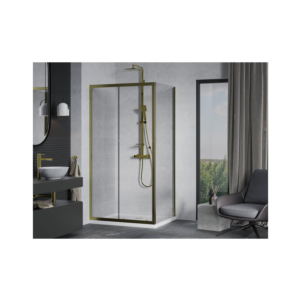 Cabina de dus Mexen Apia cu usa culisanta 140 (usa) x 90 (perete) cm, sticla transparenta 5mm, profil auriu + cadita de dus SLIM alba, 840-140-090-50-00-4010G