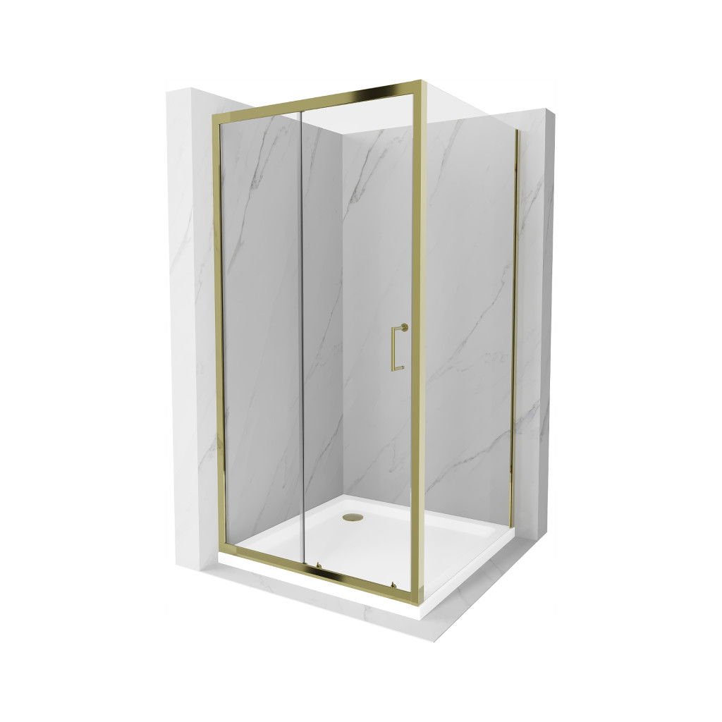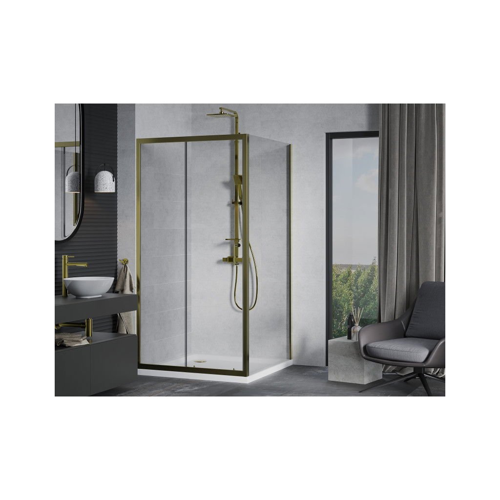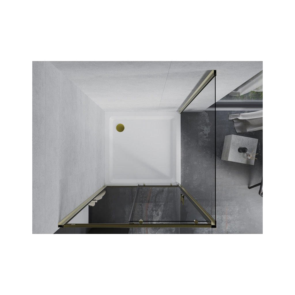 Cabină de duș Mexen Apia cu ușă glisantă 90 (uşă) x 90 (perete) cm, sticlă transparentă 5 mm, profil auriu + cadă de duș SLIM albă, 840-090-090-50-00-4010G