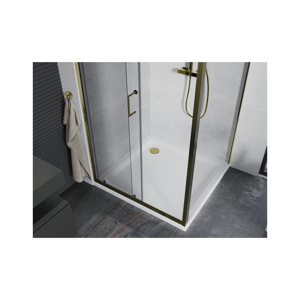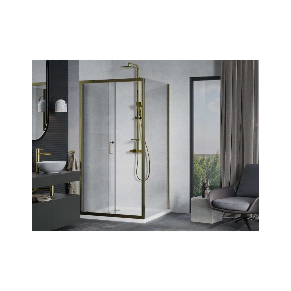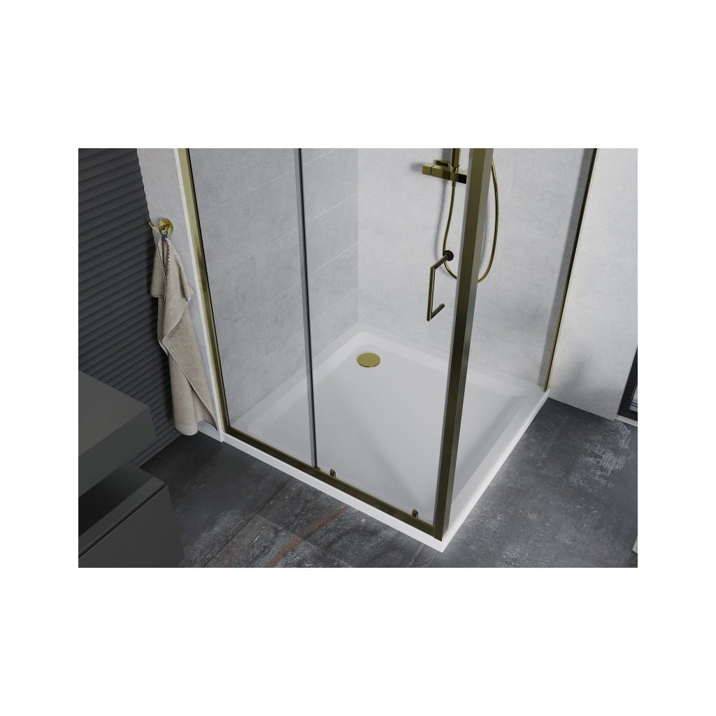 Cabină de duș Mexen Apia cu ușă glisantă 90 (uşă) x 90 (perete) cm, sticlă transparentă 5 mm, profil auriu + cadă de duș SLIM albă, 840-090-090-50-00-4010G