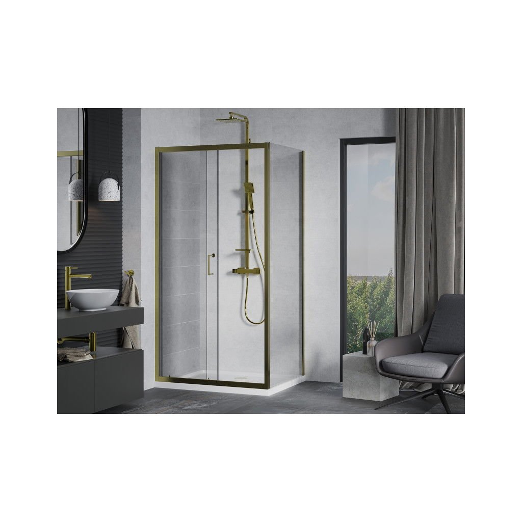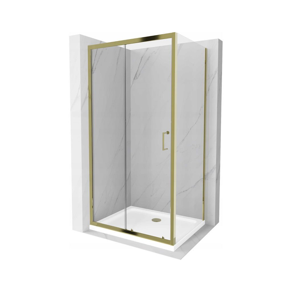 Cabina de dus Mexen Apia cu usa culisanta 120 (usa) x 90 (perete) cm, sticla transparenta 5mm, profil auriu + cadita de dus SLIM alba, 840-120-090-50-00-4010G