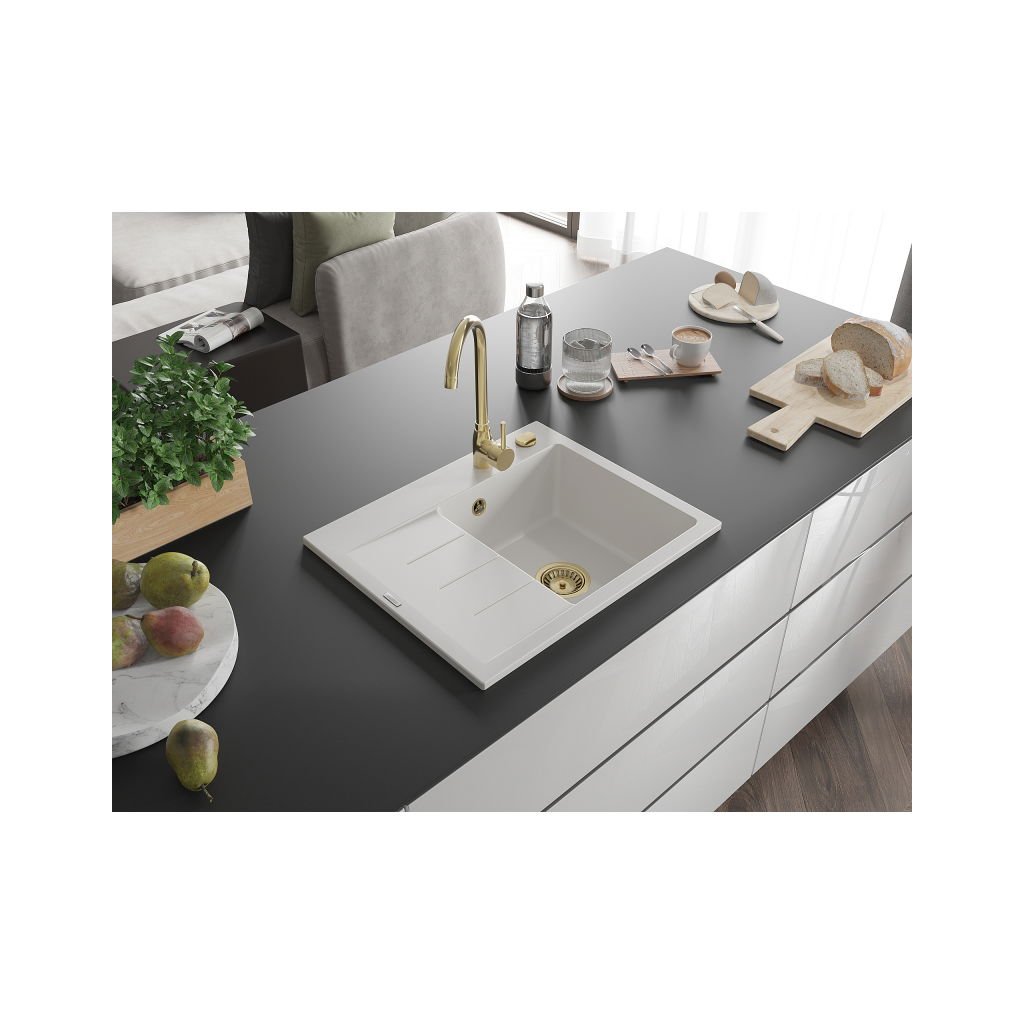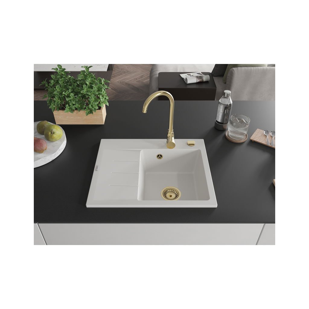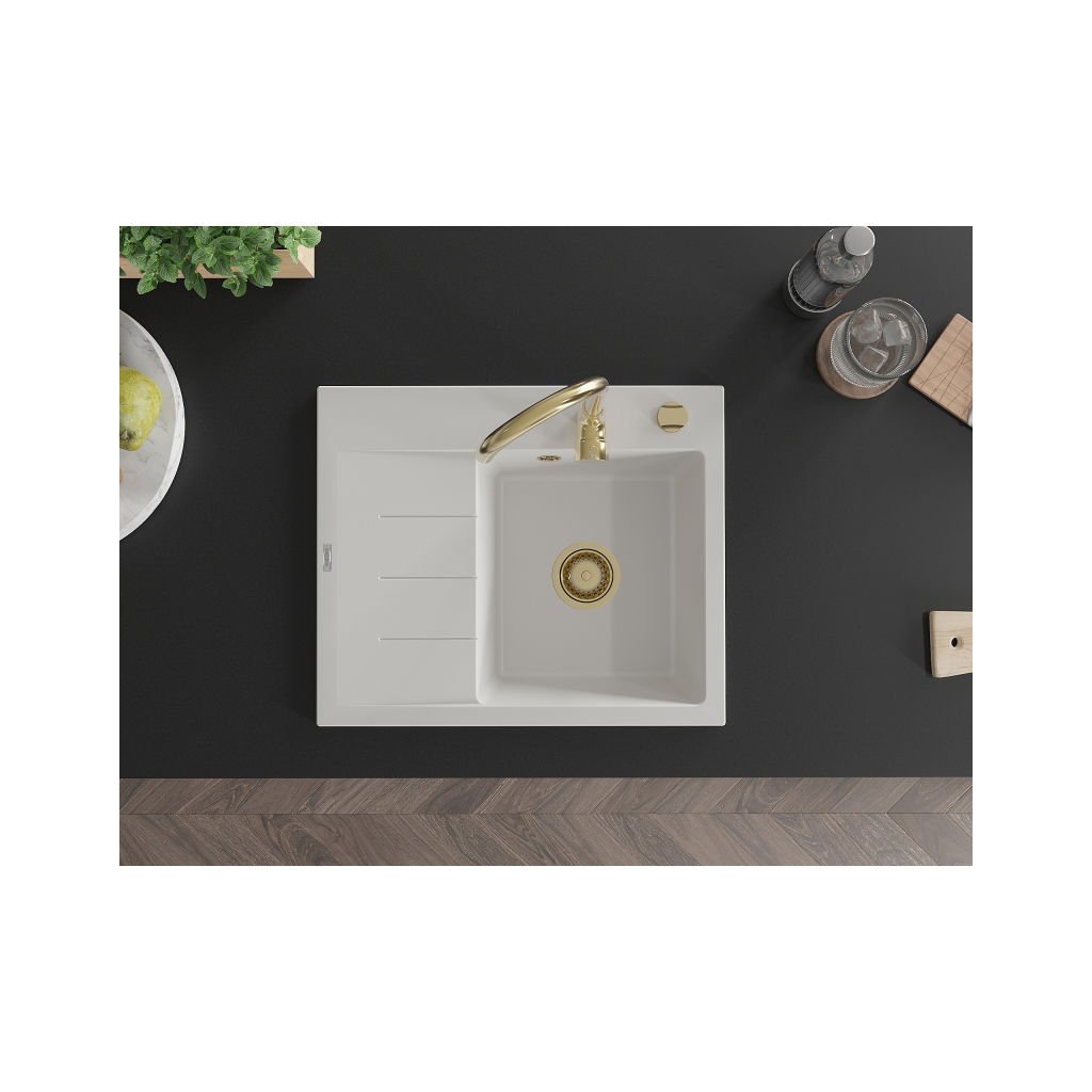 Mexen Ben, chiuvetă granit cu 1 cameră 600x500x190 mm, dreapta + sifon auriu, alb, 6523605000-20-G