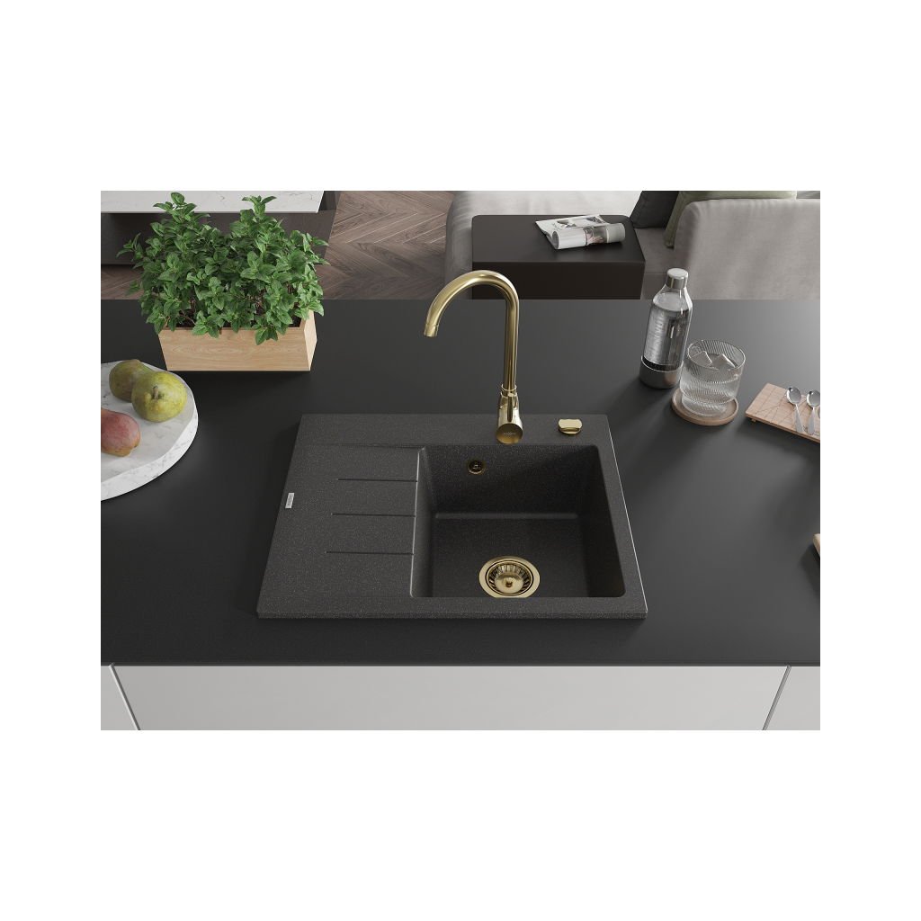 Mexen Ben, chiuvetă granit cu 1 cameră 600x500x190 mm, dreapta + sifon auriu, pete negre, 6523605000-76-G