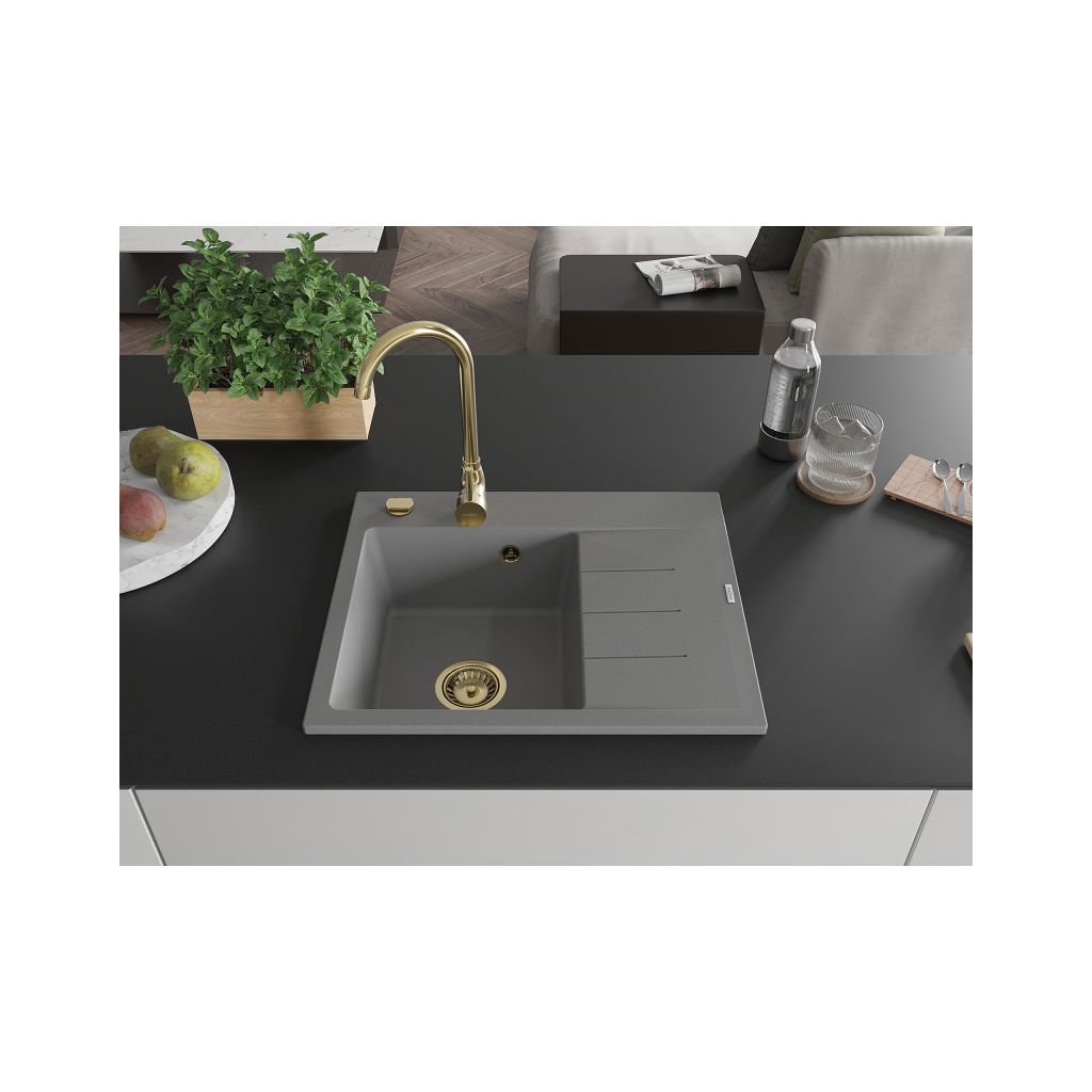 Mexen Ben, chiuvetă granit cu 1 cameră 600x500x190 mm, stânga + sifon auriu, gri, 6522605000-71-G